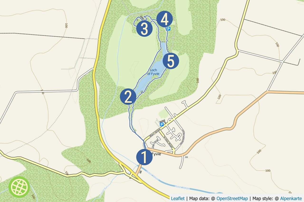 Von dem kleinen kostenlosen Parkplatz gegenüber dem Supermarkt in der Ortschaft 01 Fyvie (70 m) gehen wir auf der weiterführenden Straße an dem Denkmal für die Gefallenen aus dem Ersten Weltkrieg vorbei und biegen dann nach 75 m links in die Straße ab, die zum Fyvie Castle führt.