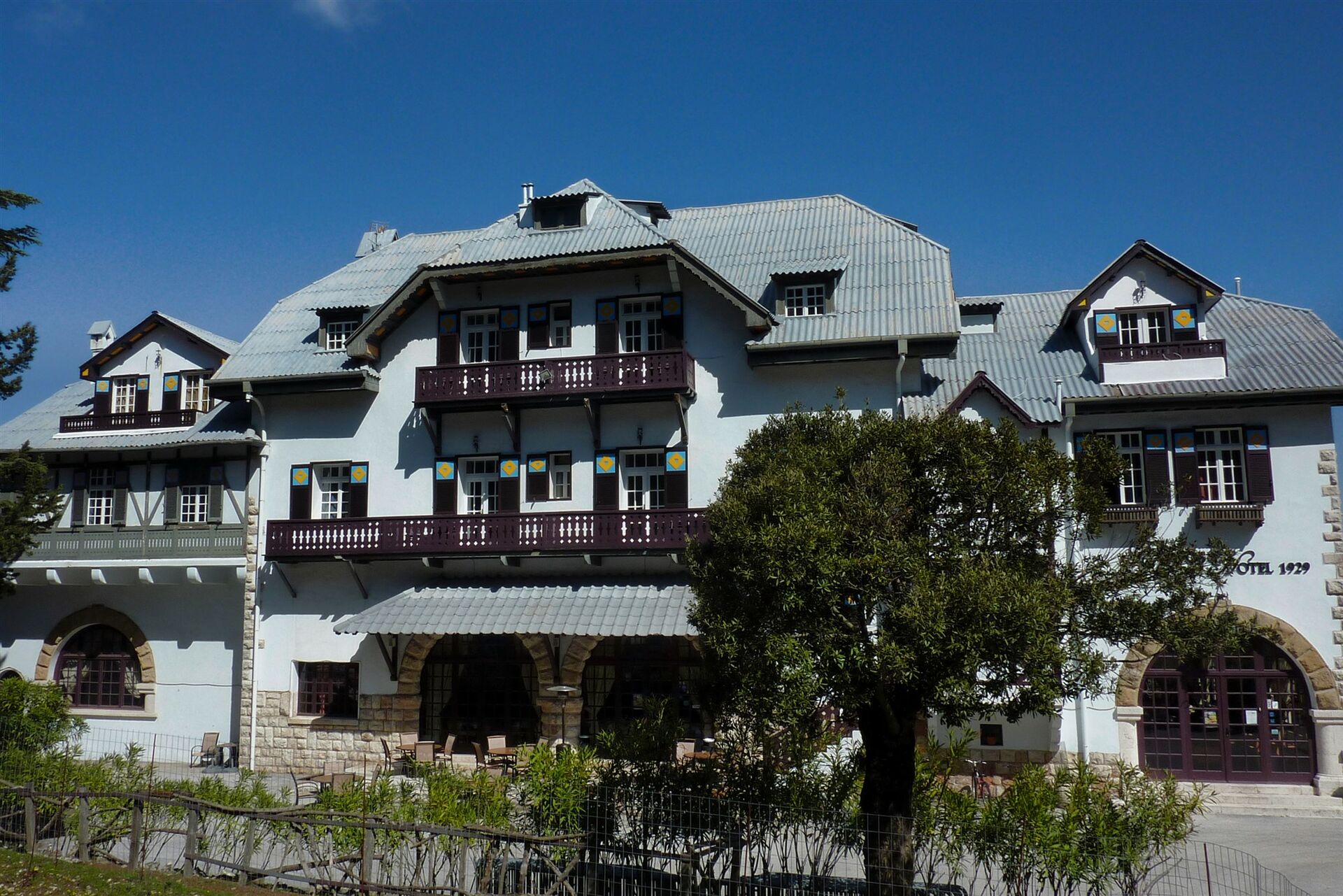 Wir beginnen unsere Wanderung am (01) Hotel Elafos (620 m). In luftiger Höhe, 619 m über dem Meeresspiegel, wurde es von den Italienern errichtet. Es beherbergt 24 liebevoll restaurierte Zimmer und ist im Stil der 30er Jahre eingerichtet. Die Anlage verfügt über den Komfort eines modernen 3-Sterne-Hotels. Blicken wir auf das Hotelgebäude, so gehen wir zunächst links, anschließend vorbei an einem zweiten verfallenen Hotelkomplex und dann auf der Schotterpiste leicht bergab in den schattenspendenden Zypressen- und Pinienwald hinein.