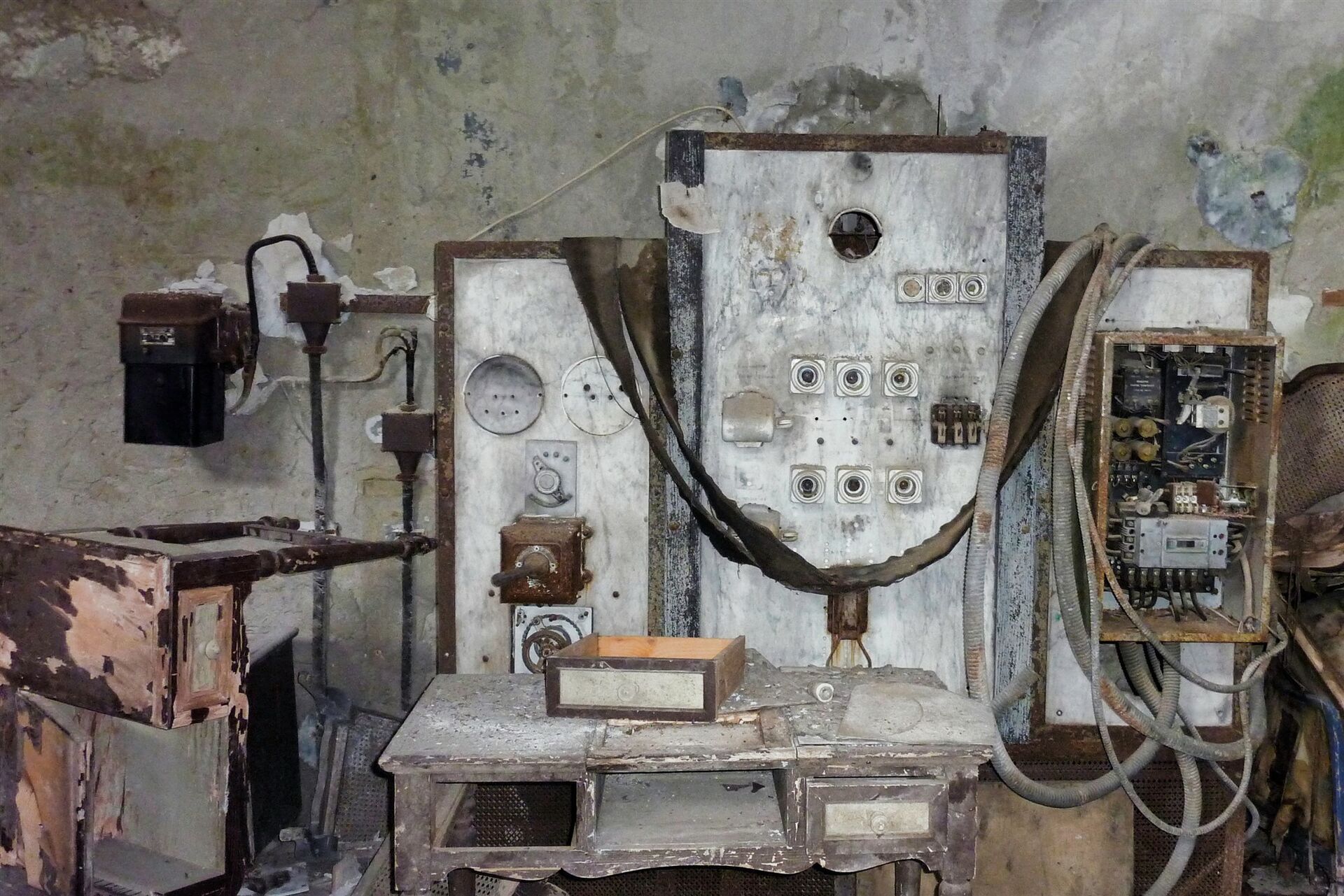 Vorbei führt der Weg an Steinhäusern, die in Tarnfarben bemalt sind – früher standen die Bäume noch nicht so eng an den Häusern. Diese dienten zur Unterbringung der Arbeiter und der Wache, zum Schutz des Gouverneurs und seiner erlesenen Gäste sowie als Werkstätten und Lagerräume. In der Ferne sehen wir ein weiteres Gebäude, die alte (02) Stromversorgung (594 m) der Anlage.