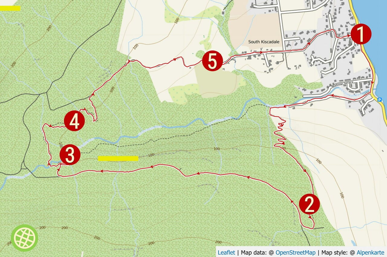 Von der 01 Bushaltestelle Whiting Bay (9 m) gehen wir noch 320 m auf der weiterführenden Hauptstraße, um dann rechts hinter der Brücke der Ausschilderung Richtung Glenashdale Falls am Flussufer entlang zu folgen.