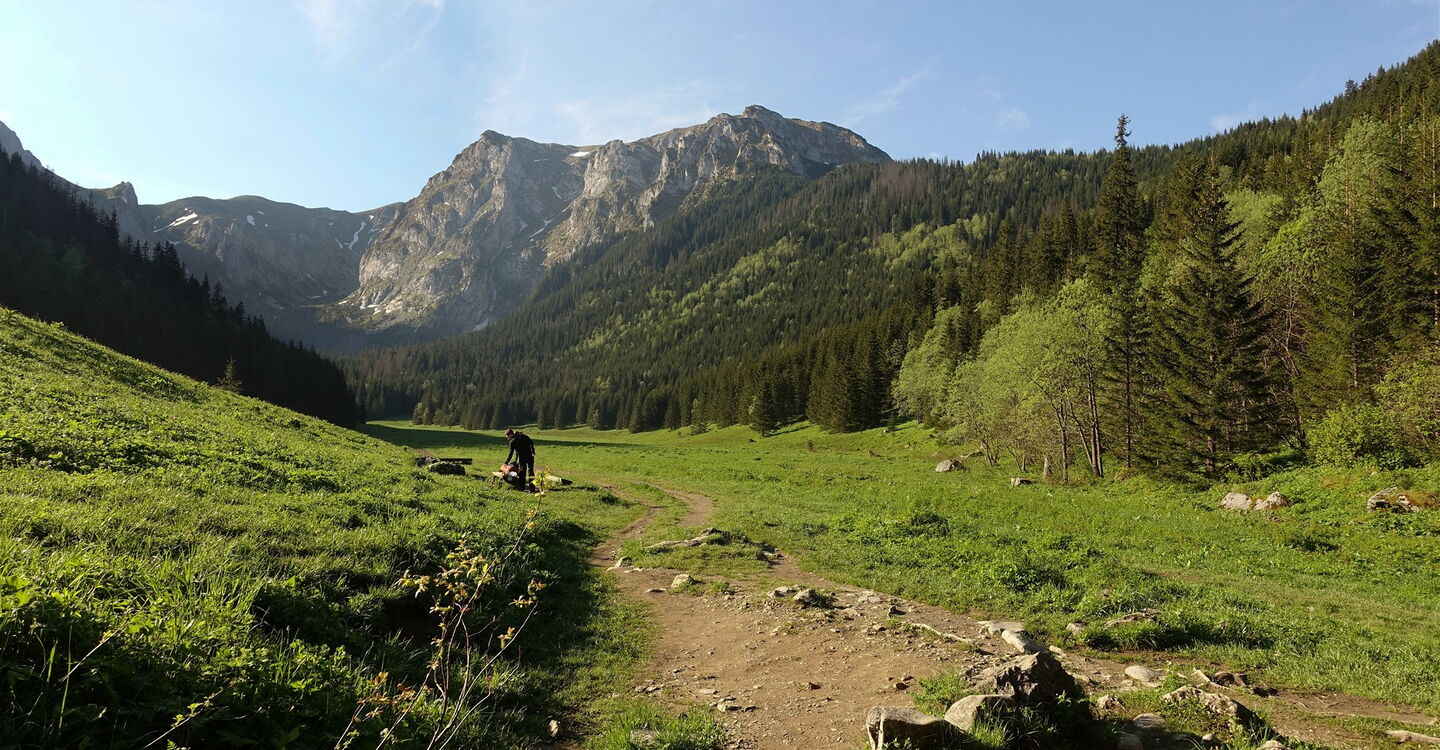 Wir erreichen die grünen und weiten Wiesen der oberen Dolina Małej Łąki und gehen an der 02 Wegekreuzung (1174 m) halb links. Das Tal, das durch die Gletscher der letzten Eiszeit geformt worden ist, ist im Frühjahr mit gelb blühenden Schlüsselblumen übersät. Am Talschluss sieht man bereits links oberhalb die mächtige Spitze des Giewont. Den halb rechts abzweigenden Pfad, der in ein Hochtal führt, lassen wir aus. Auf dem steinigen Pfad durch das Bachbett helfen gelbe Wegmarkierungen bei der Orientierung.