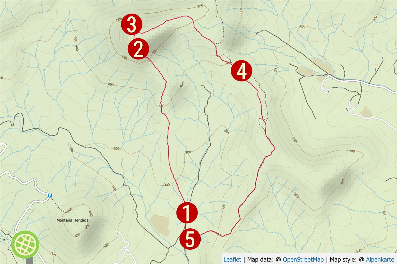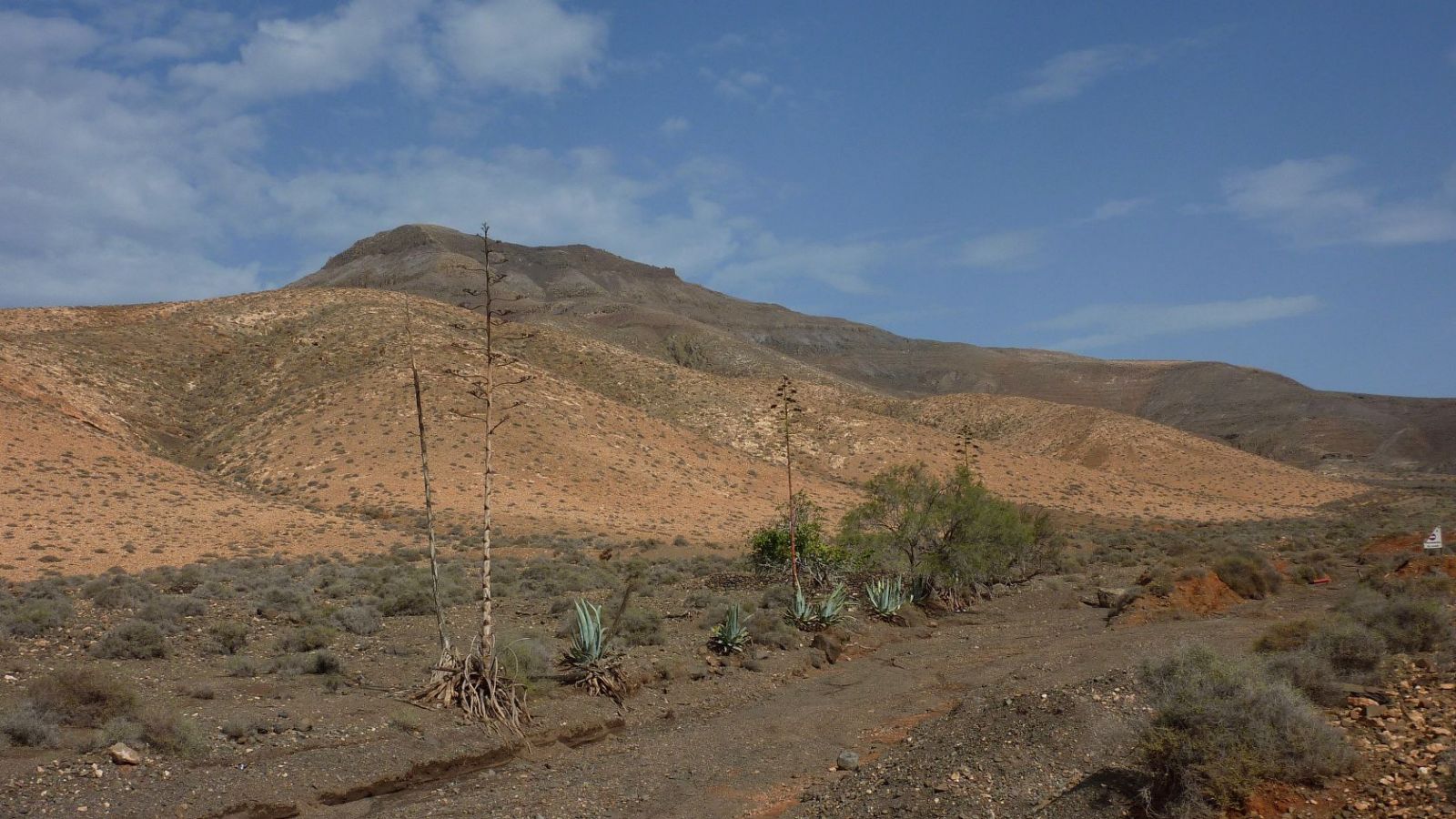 Nachdem wir das Auto am (01) Start und Ziel (253 m) geparkt haben, wandern wir noch einige Meter auf der Anfahrtspiste weiter, bis ein Verbotsschild uns am Weiterlaufen hindert. An dieser Stelle queren wir das Barranco nach links, vorbei an Agaven, Tamarisken, Feigenbäumen und einer Steinwand. Vor uns erheben sich drei Bergrücken. Der weitere Aufstieg erfolgt auf dem Bergrücken halb links – der Gipfel im Hintergrund befindet sich links von diesem. Auf einer ersten Anhöhe angekommen, ändert sich die Wegrichtung, nun gehen wir direkt auf den Gipfel zu.