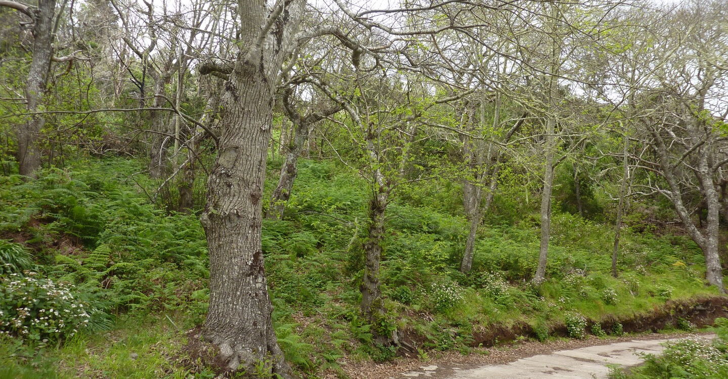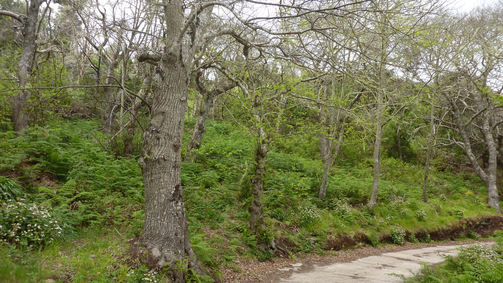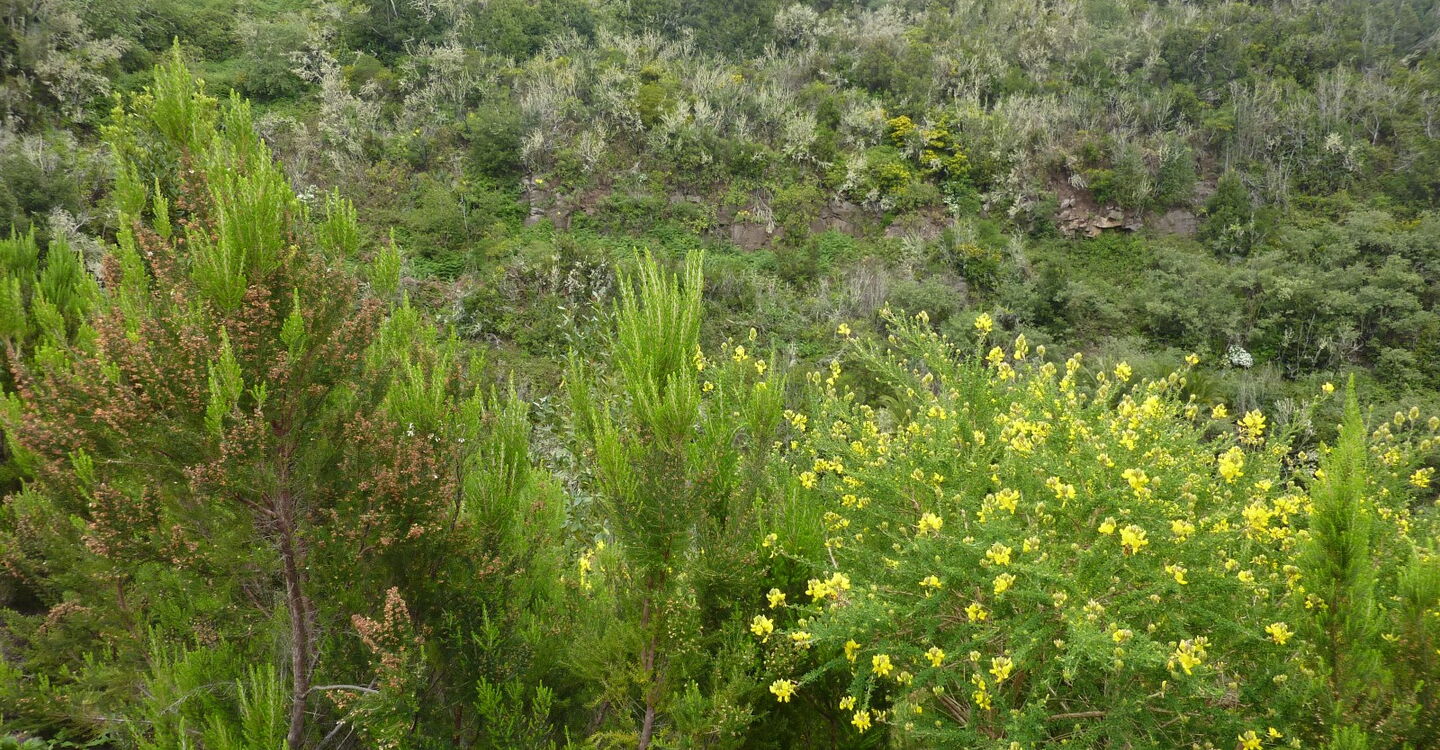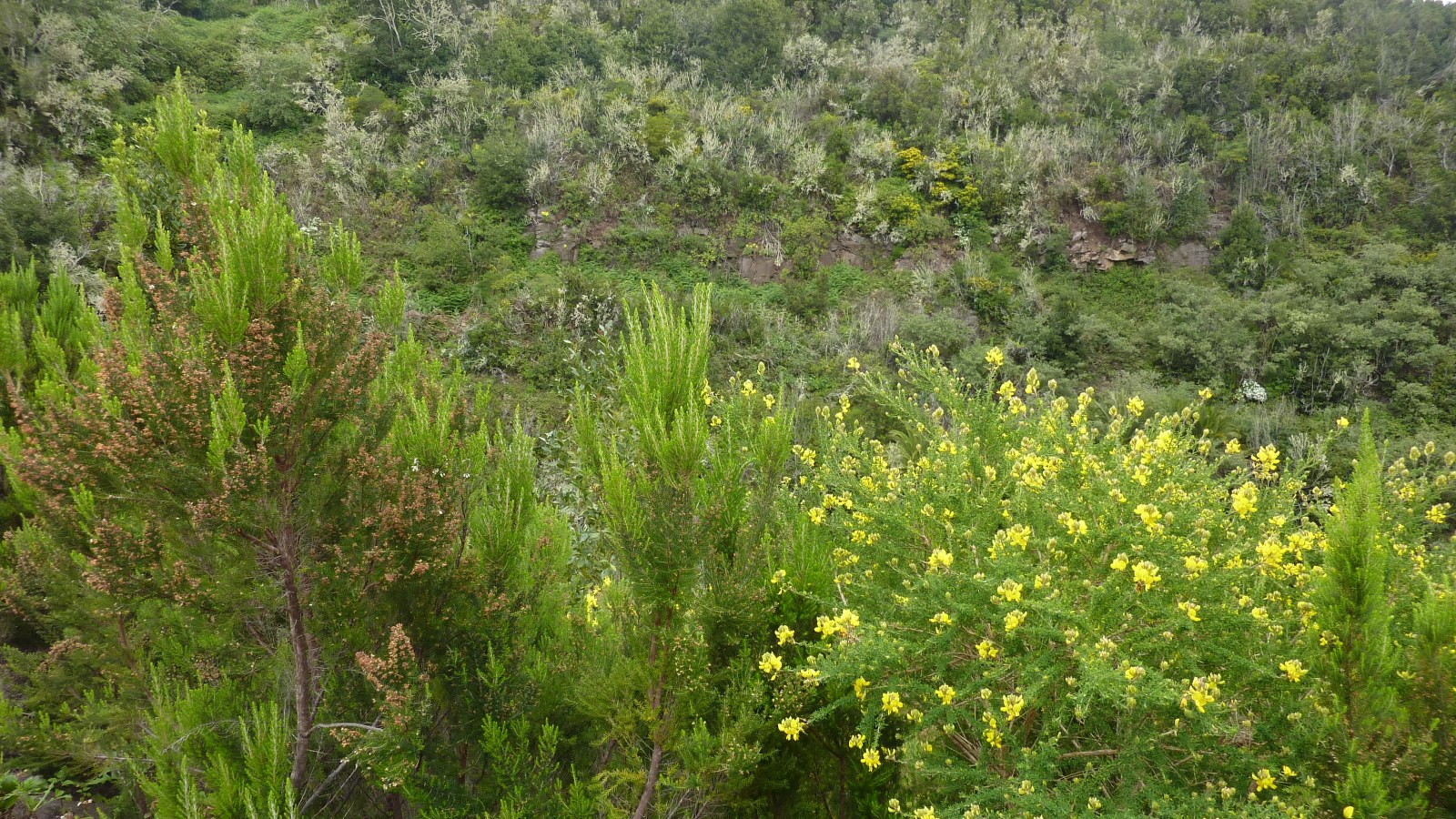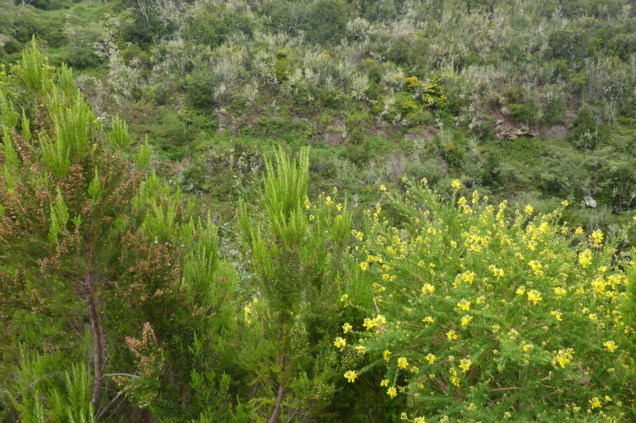 Inzwischen ist die Vegetation dichter geworden. Wir haben ein Barranco überquert und am Ende einer grünen Leitplanke - in (03) Los Acevinos (824 m) - gehen wir scharf links auf das gelbe Haus mit dem grünen Fenster zu, um am Ende des Grundstücks nach einem kurzen Abstieg auf der folgenden Betonstraße rechts weiterzuwandern.