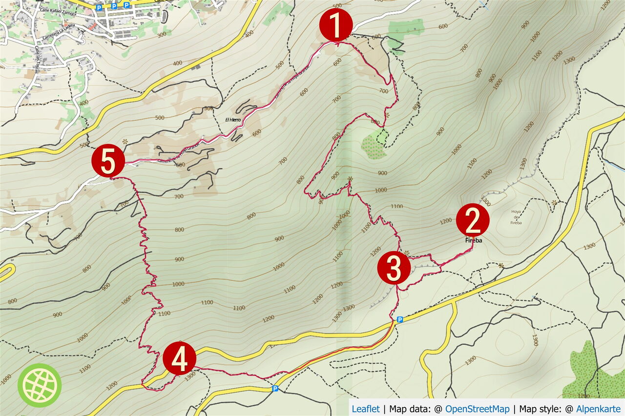 Busanbindung: keine. Pkw-Anfahrt: Der Start liegt westlich des Zentralmassivs und ist 19 km von Valverde entfernt. Man fährt auf der HI-5 Richtung Frontera und folgt der Ausschilderung zur Iglesia de La Candelaria. Gegenüber der Kirche zweigt links neben dem Restaurant die Calle Los Corchos ab, die sich bereits nach 5 m gabelt – wir halten uns halb links. Die Straße führt steil bergauf und hinter einer Einsattelung – hier führt die Straße durch Felsen hindurch – sehen wir auf der linken Seite Weinstöcke und links oberhalb eine graue Hütte. Am linken Wegesrand befindet sich eine Parkbucht. Geokoordinaten: 27.750183 -18.000283.