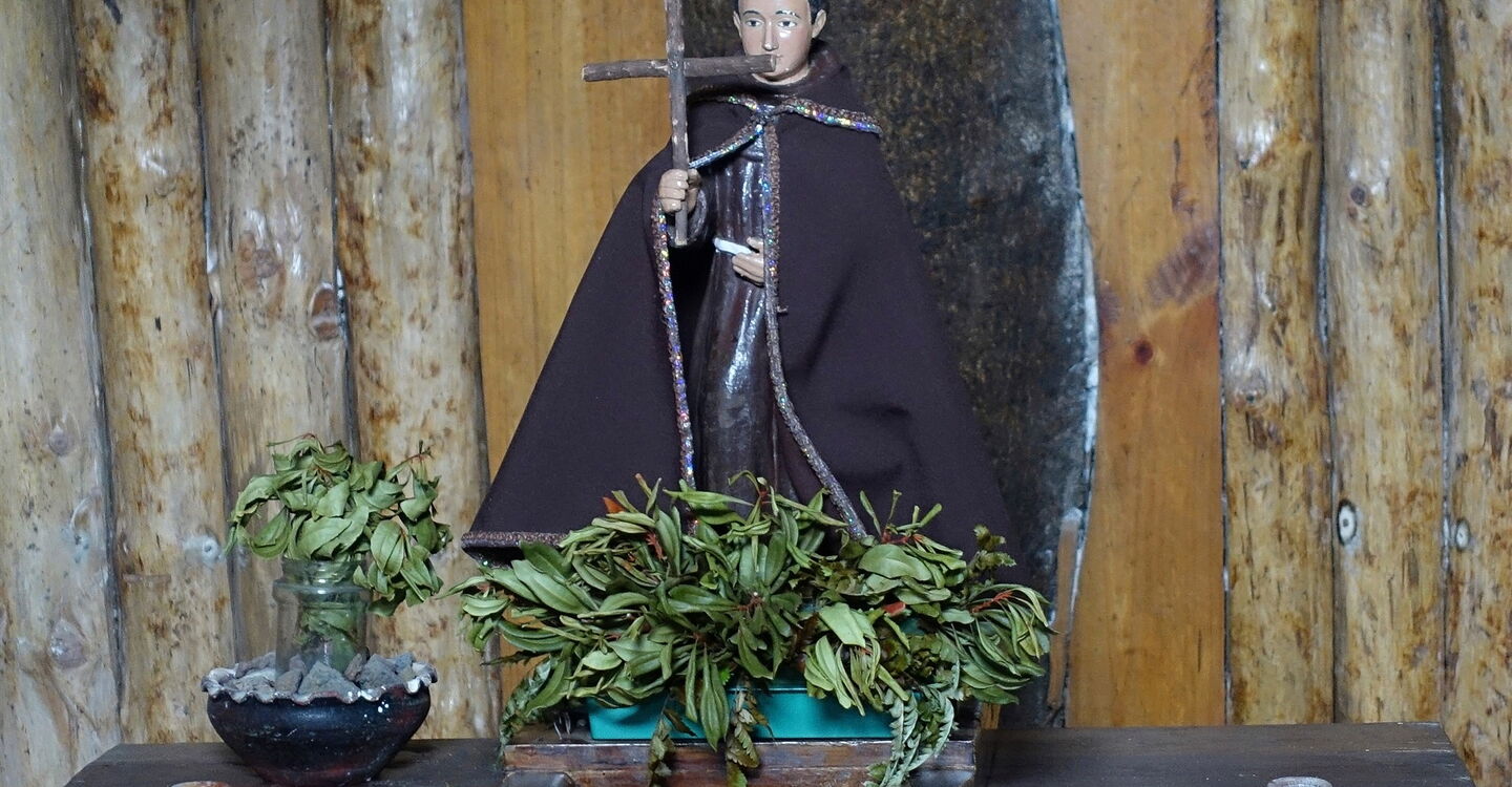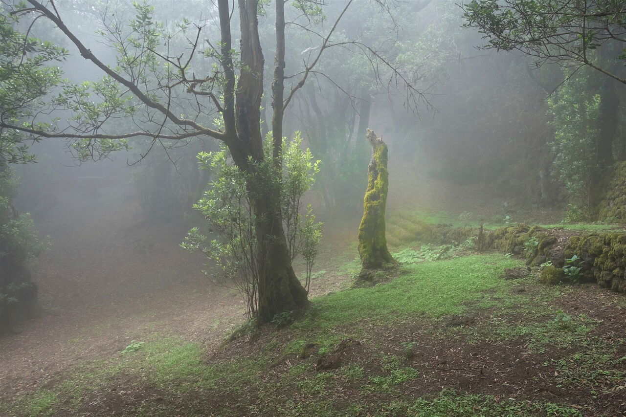 Nach 700 m auf der Straße zweigt ein 3 m breiter Pfad nach rechts ab, der in seinem weiteren Verlauf über Lapilli bis zur (04) Ermita San Salvador (1276 m) führt. Je nach Wetterlage hat uns der Nebelwald wieder eingefangen.