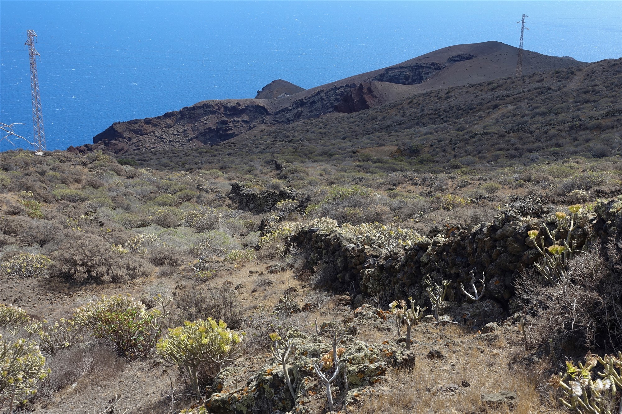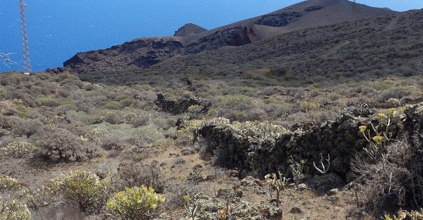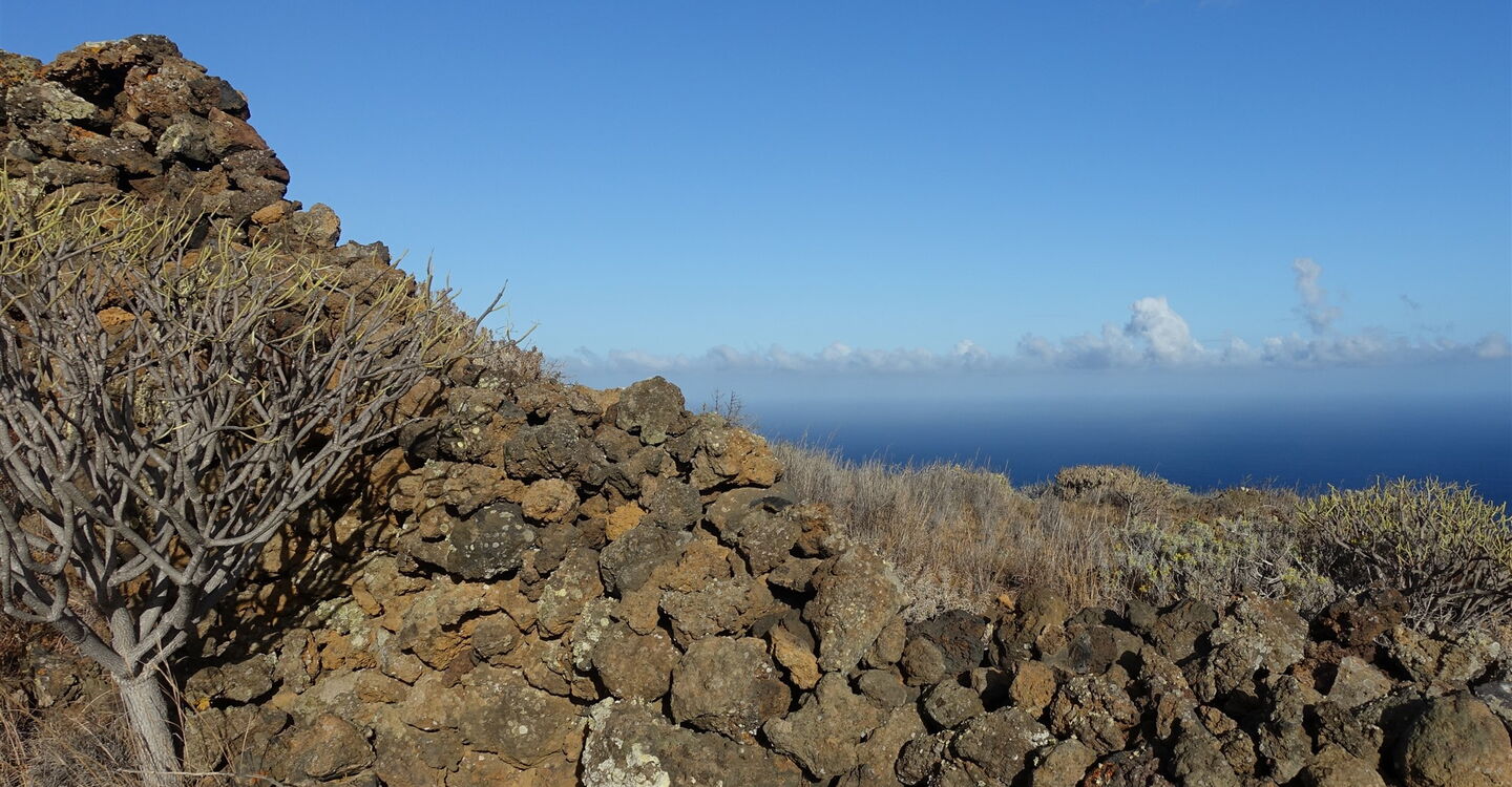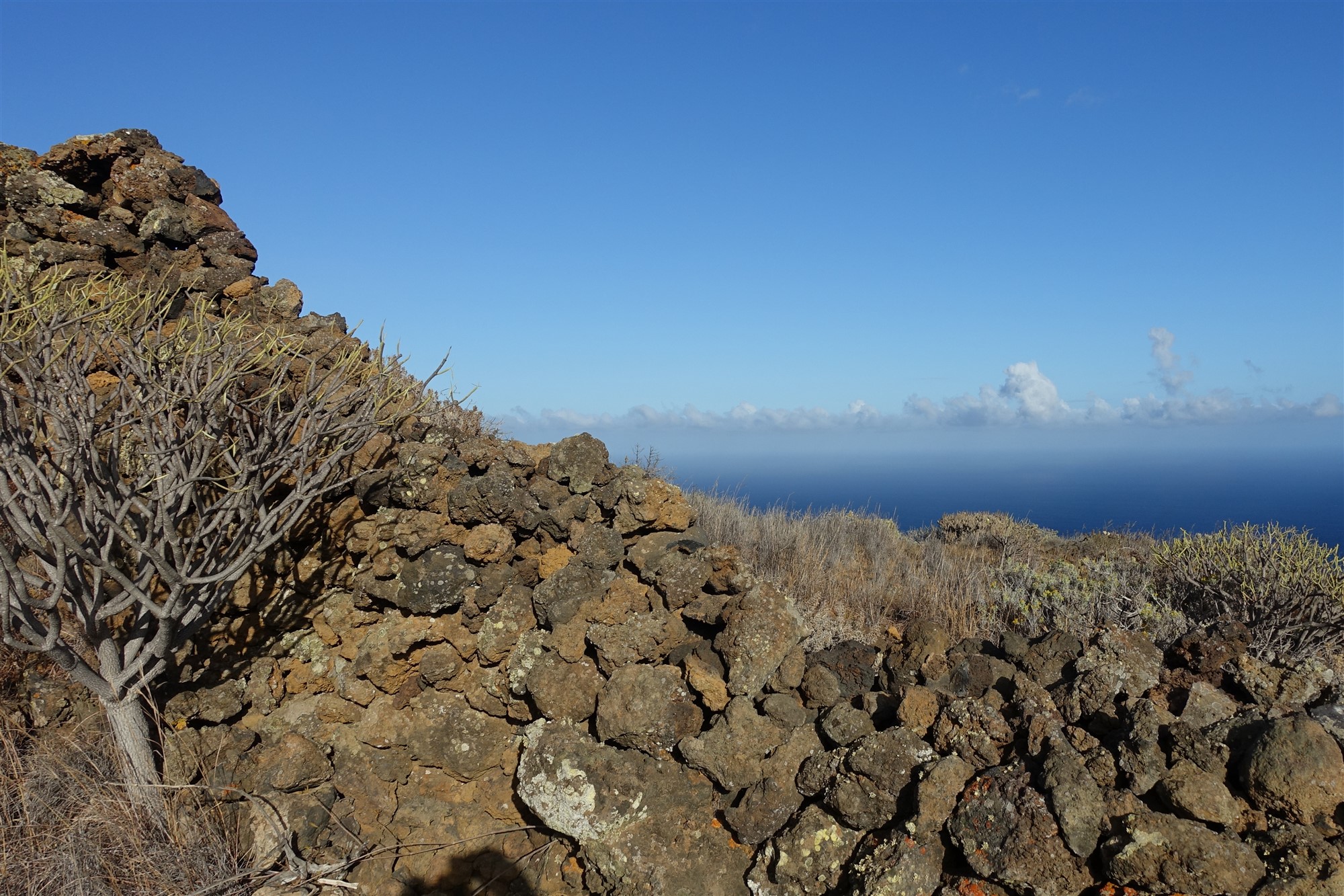 Am (01) Start und Ziel (489 m) sehen wir Steinmännchen am Straßenrand, die unseren Rückweg kennzeichnen. Wir gehen zunächst auf der Anfahrtsstraße weiter bergab, Richtung La Restinga. Nach 680 m sehen wir direkt an der Straße einen Holzpfeiler, zudem verläuft eine Trockensteinmauer links den Hang herunter. Links von der Mauer gehen wir nun in Richtung des Vulkans, der sich weit hinter einem Strommast befindet. Nach 450 m Abstieg erreichen wir eine quer verlaufende Trockensteinmauer.