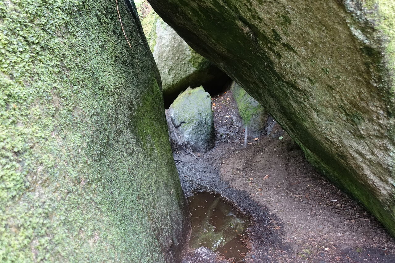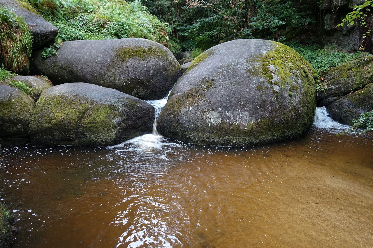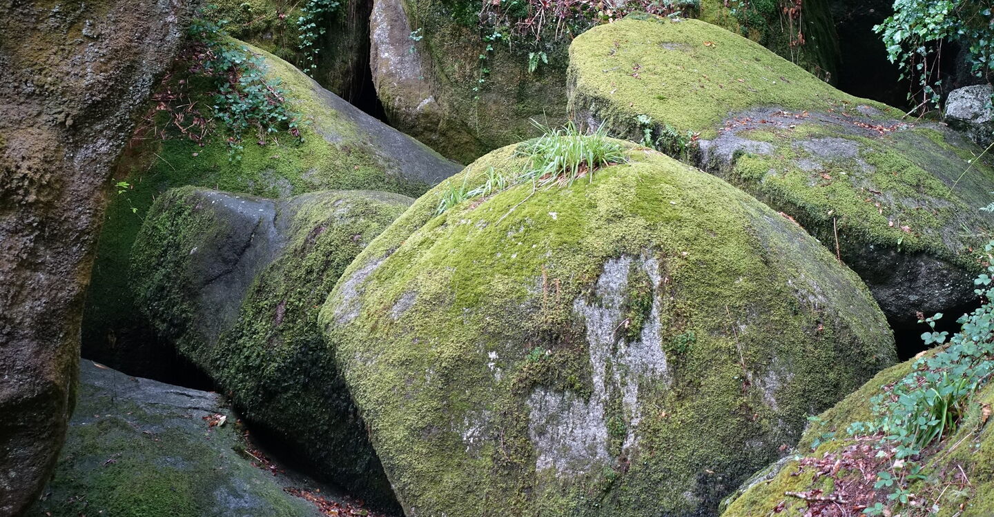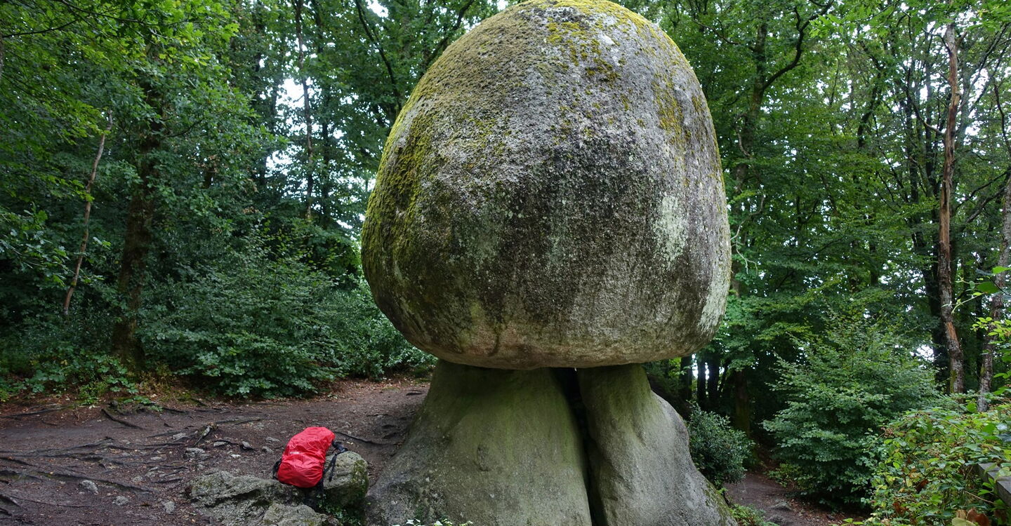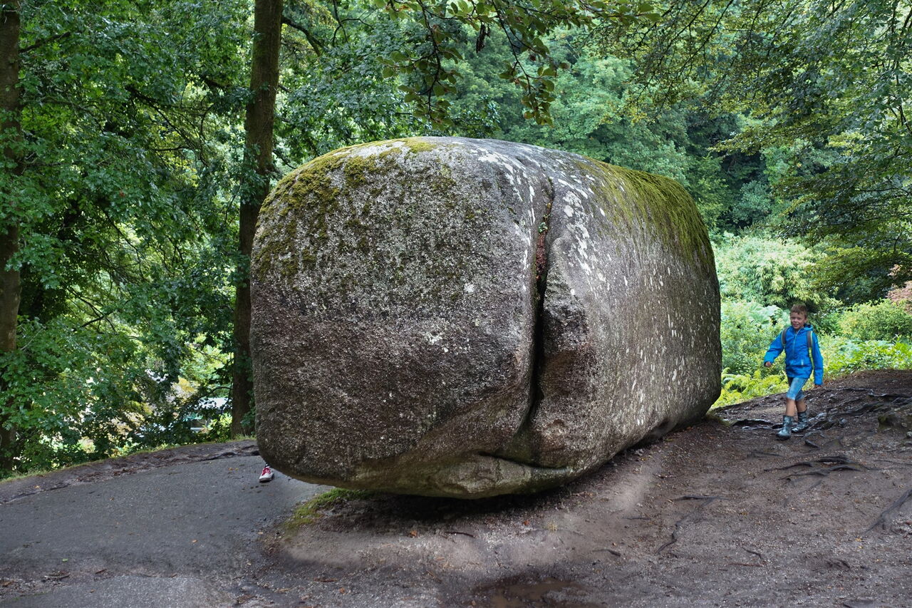 Vom Parkplatz – Start und Ziel der Wanderung – hinter der aus dem Jahr 1591 stammenden Église Saint-Yves de Huelgoat gehen wir bis zum Place Aristide Briand vor und dort rechts durch die Straße bis zum See. Hinter der Brücke befindet sich die alte Mühle Moulin du Chaos. Sie wurde 1339 erbaut und ist das älteste Gebäude in Huelgoat. Wir gehen bei der Crêperie rechts auf dem Pfad weiter. Zwischen den mit Moos bedeckten, riesigen Felsen hindurch erreichen wir die Grotte du Diable (Teufelsgrotte), bei der man über eine rutschige Eisentreppe in die Unterwelt absteigen kann. Auf dem weiterführenden Pfad geht es an mächtigen und rund geschliffenen Granitblöcken vorbei. Bei der ersten Weggabelung gehen wir dann halb links, überqueren den inzwischen unterirdisch verlaufenden Bachlauf und nehmen den ersten Treppenaufstieg, der an einer kleinen Höhle vorbeiführt. Über einen platt geschliffenen Felsen und in den Fels geschlagene Stufen gelangen wir zum 01 Roche Tremblante (164 m) herunter. Der sogenannte zitternde Felsen liegt auf einem schmalen Grat. Findet man den richtigen Druckpunkt in Kombination mit der richtigen Frequenz, so wird der 100 t schwere Granitblock in eine 2 bis 3 cm weite Schwingung versetzt! Bloß wo ist der Punkt?