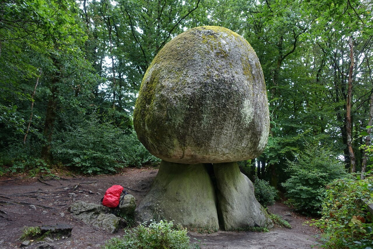 Wir gehen auf dem Hinweg bis zum platt geschliffenen Felsen zurück, um dann aber geradeaus weiterzuwandern. Wir gehen an einer Steinbank vorbei, ein kurzes Stück parallel zu einer Straße, zwischen den Häusern hindurch und weiter bis zu einer Hauptstraße. Auf dieser gehen wir 60 m rechts und kommen an dem links liegenden Supermarkt vorbei. Über den nach rechts abzweigenden Pfad erreichen wir den 200 t schweren Granitblock 02 Le Champignon (177 m). Nicht nur, dass man so viele Tonnen Granit auf einem Platz findet, nein, er ähnelt auch noch einem riesigen Pilz. Wir gehen wieder bis zur Hauptstraße zurück und überqueren diese, um auf der weiterführenden asphaltierten Straße weitere 200 m zu gehen. Weit vor einem Parkplatz und kurz vor einer Picknickbank zweigen wir nach links auf den unscheinbaren Pfad ab.