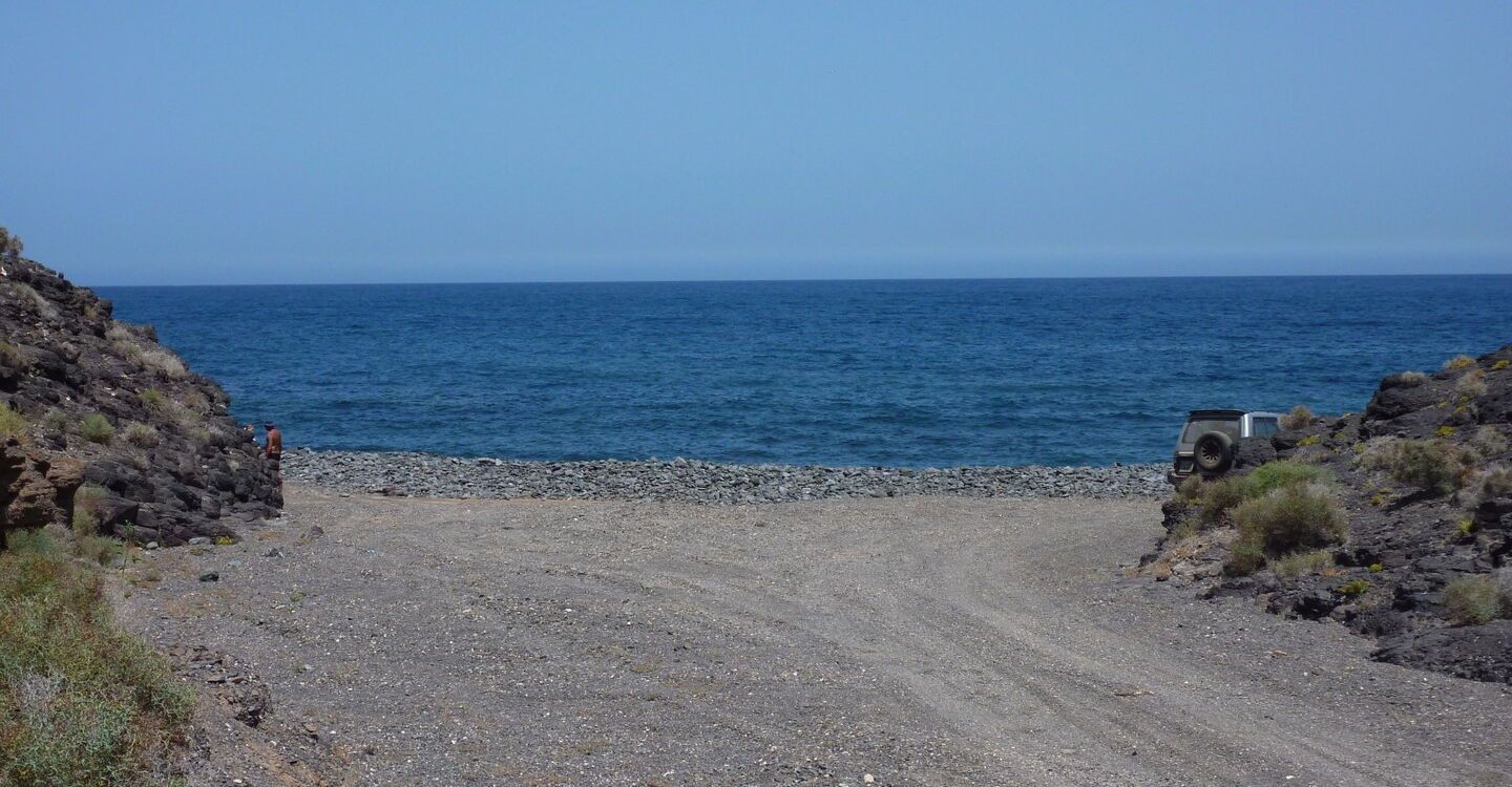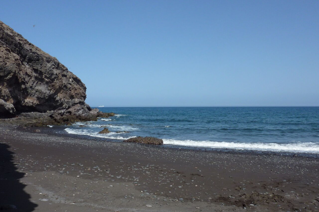Wir gehen wieder 100 m in nördlicher Richtung im Barranco zurück. Links, in südwestlicher Richtung, steigen wir nun weglos auf. Wir befinden uns in einem Barranco mit schwarzem Lavastein und gehen dort weiter, bis wir oberhalb der Klippe ankommen. Halb links sehen wir nun einen großen Steinhaufen, auf den schon bald ein zweiter großer Steinhaufen folgt. Wir folgen dem eingeschlagenen Weg noch weitere 100 m und ändern dann die Richtung. Der Abstieg zum Strand ist an dieser Stelle nicht möglich, daher gehen wir zunächst für 130 m rechts, parallel zu dem vor uns liegenden Barranco. Dort angekommen, können wir in das Barranco absteigen. Der Abstieg ist jedoch steil, weiterhin weglos und erfolgt auf rutschigem Geröll. Sobald wir im Barranco sind, gehen wir links, sodass wir in seinem Verlauf bis an den (04) Traumstrand (2 m) Playa Ajaches Nationalpark 1 gelangen. Eine Bucht mit feinem, schwarzem Lavasand, durchsetzt mit kleinen Steinen, Schatten spendenden Stellen sowie perfekten Badebedingungen lädt zum Verweilen ein.