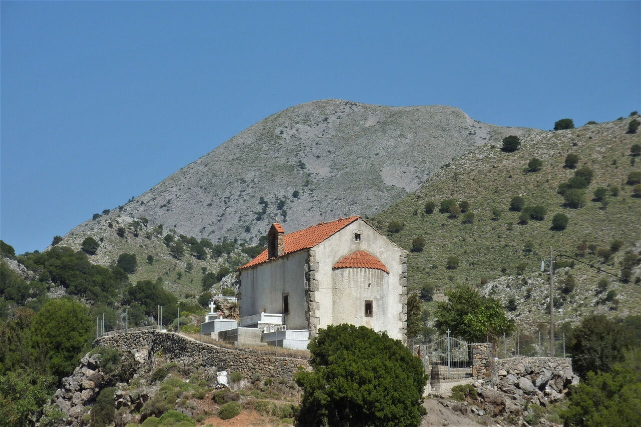 In Kallikratis gehen wir von dem Café 01 Wild Herbs (710 m) auf der Asphaltstraße Richtung Frangokastello. Nach 1,9 km, die Straße steigt wieder mäßig an, biegen wir halb rechts auf den ausgezeichneten Pfad E4, der uns in die Schlucht von Kallikratis führt. Wir wandern auf einem wunderschön angelegten Steinpfad durch die Schlucht. Er verband die Weideflächen in den Bergen bei Kallikratis mit den Dörfern in der Talebene. An der engsten Stelle ist die Schlucht nur 10 m breit, bis zu 250 m überragen die seitlichen Felswände das Bachbett, in der Ferne sieht man das azurblaue Meer.