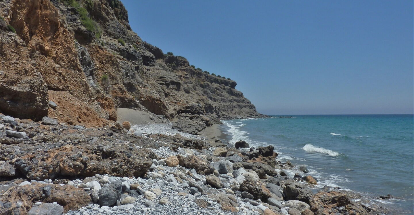 Hier gehen wir 50 m links und bei dem folgenden großen Steinhaufen auf einem Küstenpfad oberhalb der Klippen, bis zu einer Schlucht. An dieser gehen wir zunächst schluchteinwärts, bis wir über Ziegenpfade in die Schlucht absteigen und zum Meer gehen. Weiter geht es direkt unterhalb der Steilklippen, vorbei an wunderschönen Sandstränden, bis zur einer 03 Schlüsselstelle (5 m). Hier gehen wir 145 m in die Schlucht, bis an die Stelle, wo der Pfad zur rechten Schluchtwand weiterführt. Links von uns befinden sich ein Ziegenzaun und ein Steinmännchen. Am Zaunabschnitt, der parallel zur Schlucht verläuft, gehen wir weglos, bis wir auf Bänder stoßen, an denen man den Zaun öffnen und verschließen kann. Unterhalb der Felsen steigen wir bis zu einer Minieinsattelung auf, wo sich ein weiterer Ziegenzaun befindet. Wir öffnen und verschließen ihn und gehen auf der Schotterpiste 100 m bergab, um bei der nachfolgenden Weggabelung halb rechts zu gehen.
