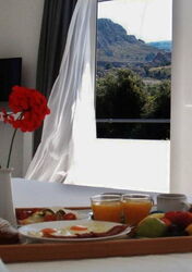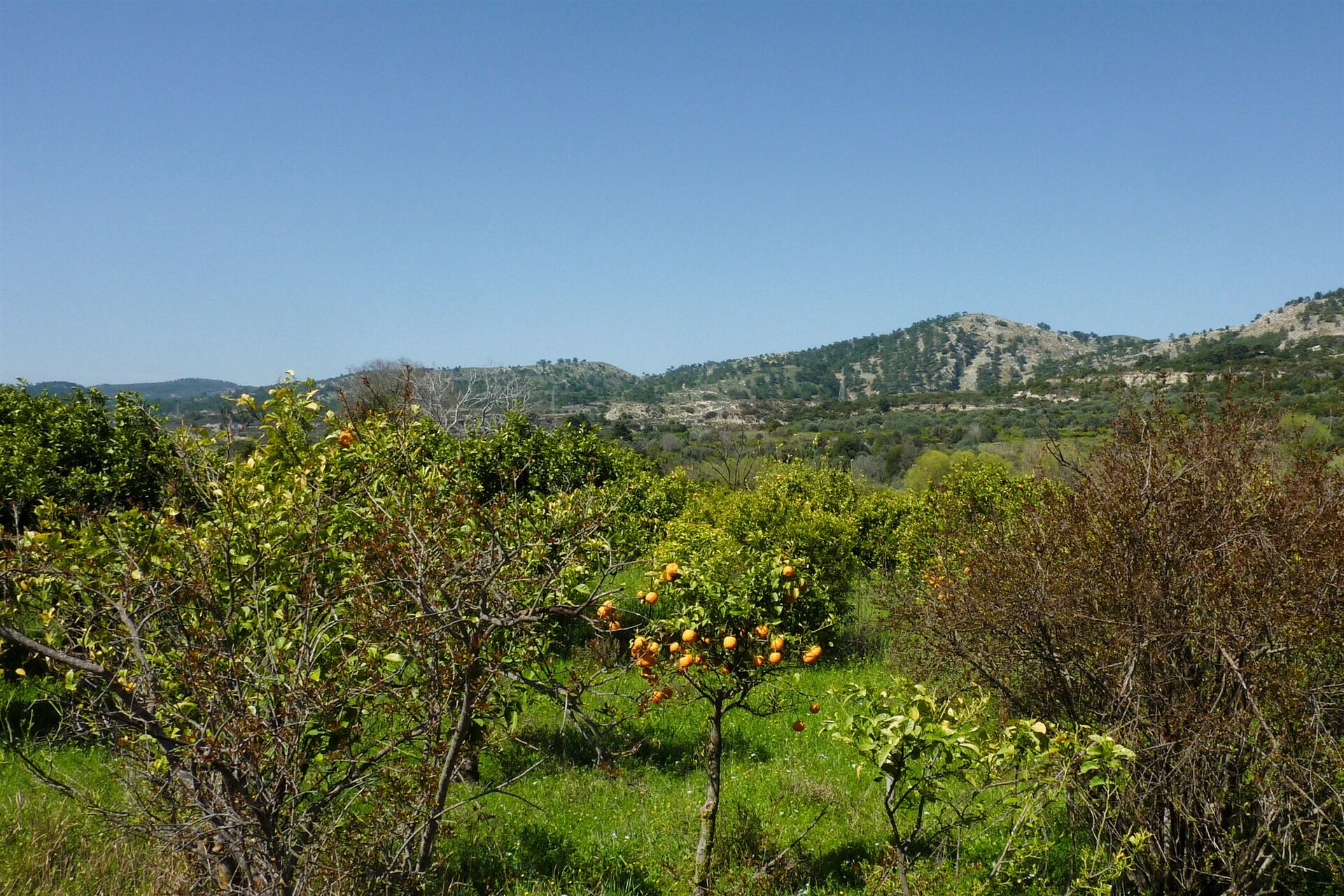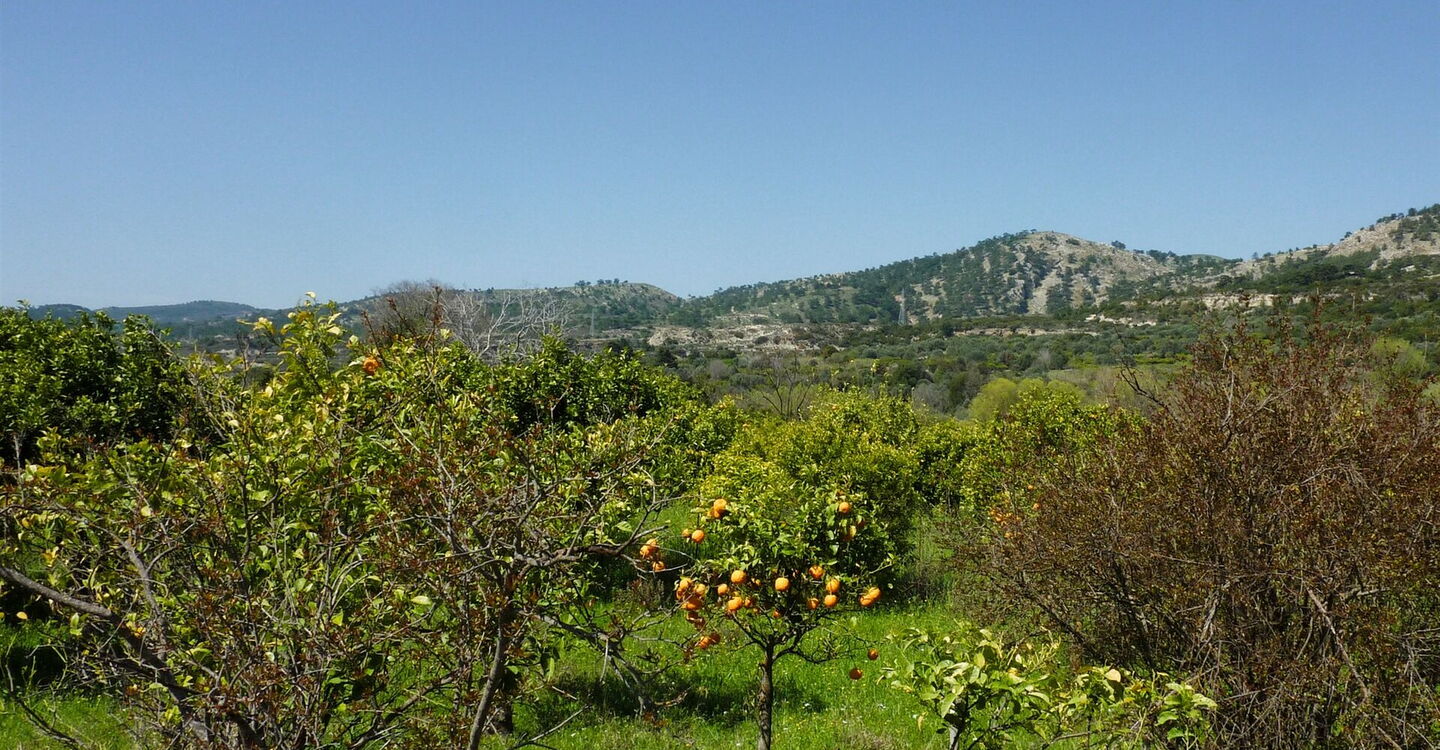 Bei mächtigen Zypressen erreichen wir die (02) Kapelle der Jungfrau Eleimonitria (98 m). Diese lassen wir rechts liegen und wandern auf der betonierten Piste bergauf. Es geht vorbei an einem Viadukt und weiteren Plantagen, tiefer in den sich verengenden Talkessel. An einer 180°-Kehre der Piste befindet sich am Wegesrand eine Metallstange. An dieser Stelle verlassen wir die Piste und gehen halb links auf dem Pfad weiter, der in kleinen Kehren bergab an Bewässerungsleitungen und Plantagen entlang verläuft.