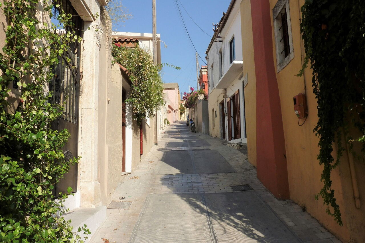 Auf Ziegenpfaden steigen wir durch dichtes Buschwerk in die 03 Schlucht von Astraki (170 m) hinunter. Wir gehen jetzt 1,2 km durch diese Schlucht, zuerst noch unwegsam, aber schon bald treffen wir auf E4-Markierungen und einen Pfad. Wir erreichen eine 2. Schlucht, aber bitte nicht in die Schlucht links herein wandern, sondern den weiß-roten Markierungen bis zu einer Steinbrücke aus der Schlucht heraus folgen. Wir gehen auf der bergauf führenden Piste bis zum Ende. Weiter geht es rechts bergauf, bis der Weg bei einem Strommast und einer Ruine endet. Wir gehen 50 m rechts, um bei der Kirche sofort wieder links abzubiegen. Unser Weg mündet in eine Asphaltstraße und endet an einer Hauptstraße. Dort am Platz gehen wir rechts und sofort wieder links, um dann bei der folgenden Kirche, auf die wir zugehen, rechts weiter durch den Ort Myrtia zu spazieren. Nach 70 m erreichen wir das Nikos-Kazantzakis-Museum.