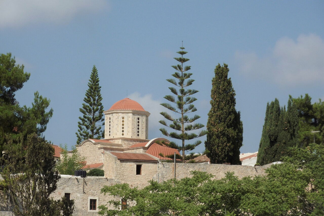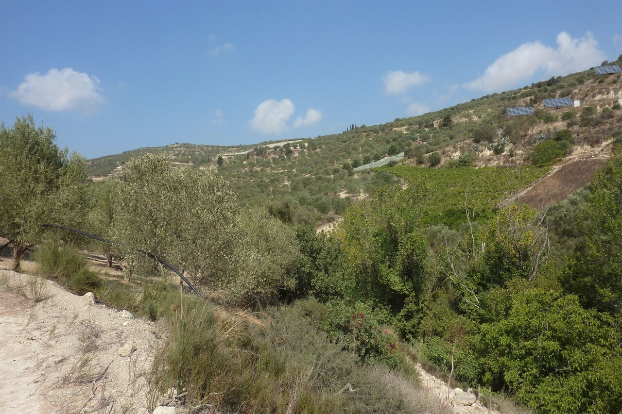 Diese lassen wir links liegen und gehen auf dem weiterführenden Weg in westliche Richtung, den rechten Abzweiger ignorieren wir. In der Ferne können wir bereits das 02 Agarathos-Kloster (367 m) ausmachen, eines der ältesten Klöster auf Kreta. Wir gehen auf der bergab führenden Asphaltstraße, bis sie endet. Anschließend gehen wir nur 190 m links Richtung Kastelli, um dann halb rechts parallel zu den Weinstöcken zu wandern. Am Ende dieser gehen wir nun weglos durch die Olivenbäume bergab, halten uns dabei so weit wie möglich links und erreichen so die linke Ecke im Olivenhain. Ein Stock und 2 Steine markieren eine Stelle, wo man den Zaun übersteigen kann.