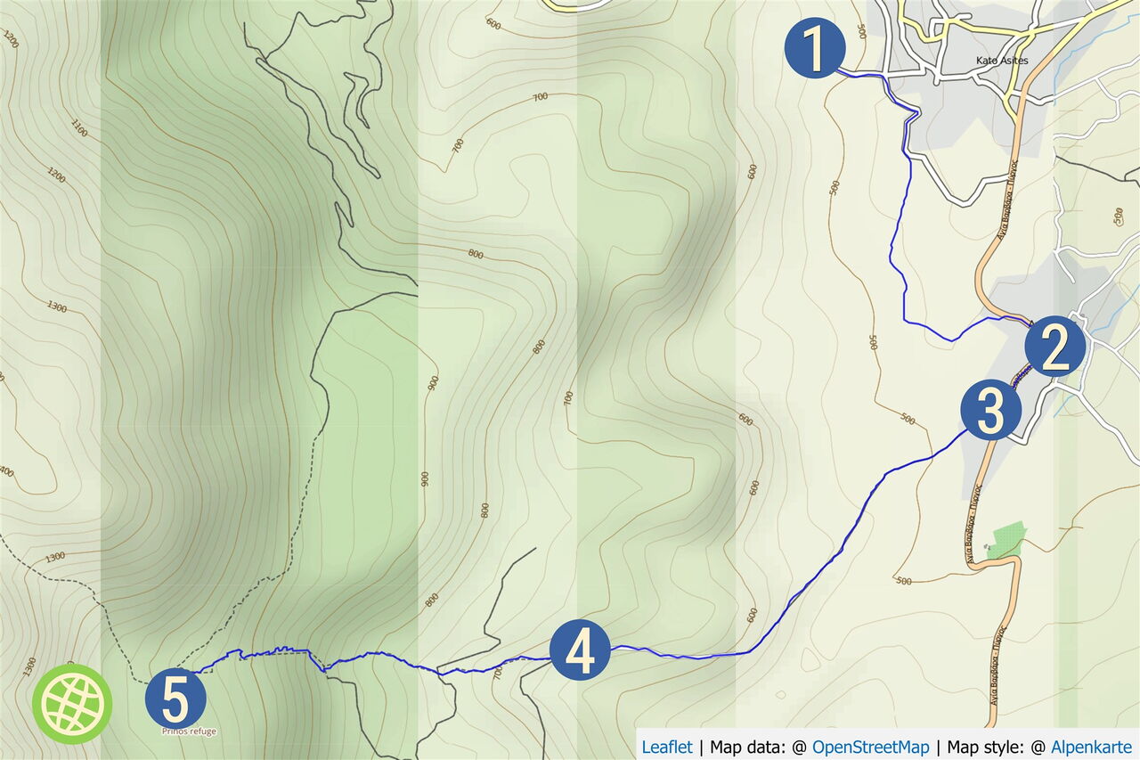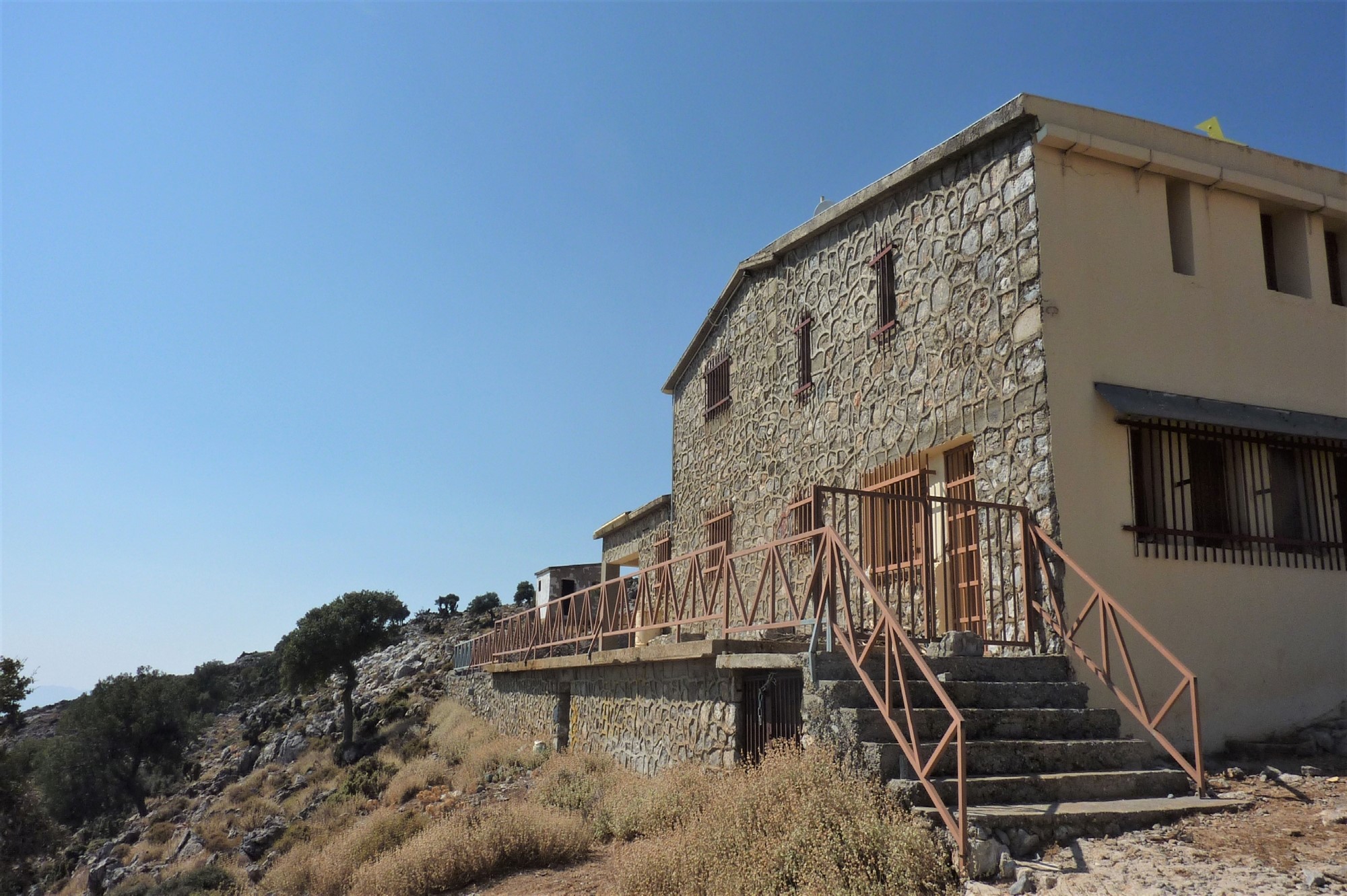 Die Markierungen ändern ihre Farbe von gelb in rot. Auf Höhe einer großen Platane kann man bereits in der Ferne die 05 Schutzhütte Prinos (1092 m) ausmachen. Die Schutzhütte Prinos liegt auf einer Höhe von 1100 m an den östlichen Hängen der Psiloritis-Berge. Von hier ergeben sich Wandergelegenheiten zu den Gipfeln Koudouni und Gyristi sowie zum Rouvas-Wald (4 Stunden) und dem Nida-Plateau (7 Stunden). Die Schutzhütte ist seit 1967 in Betrieb und hat ein Fassungsvermögen von 30 Personen. Auf Anfrage beim Mountaineering Club von Heraklion kann man dort übernachten.