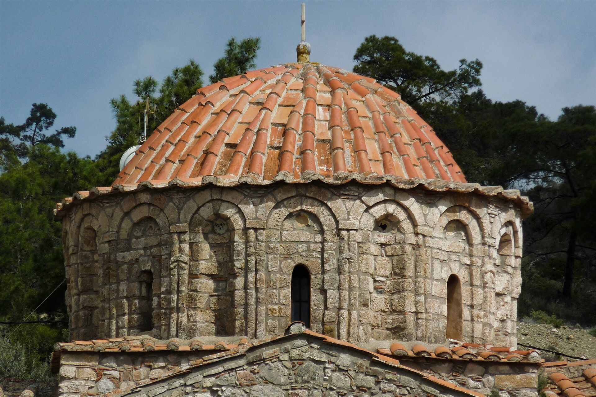 Wir gehen auf der weiterführenden, breit ausgebauten Schotterpiste durch einen lichten Wald und erreichen nach 2,5 km das (04) Kloster Moni Thari (278 m), idyllisch gelegen in einem Kiefernwald. Früher verlassen, wird das Kloster seit einigen Jahren wieder von einer Klostergemeinschaft betrieben.