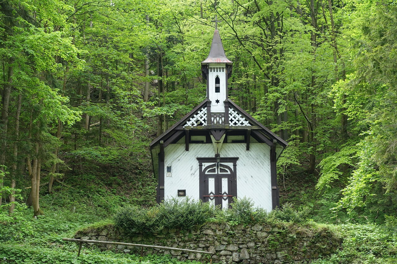 In dem kleinen Dorf 01 Korytnica-kúpele (822 m) marschieren wir taleinwärts bis zu einer Brücke, um dort an der Weggabelung halb links auf der asphaltierten Straße bergauf zu gehen. Zunächst gehen wir links an einem Bachlauf entlang. Wir queren dann einen weiteren Bachlauf, der in den Bachlauf fließt, an dem wir links entlanggehen. An dieser Stelle verlassen wir die Asphaltstraße nach links und wechseln auf einen Weg. Nach einigen Metern überqueren wir denselben Bachlauf, den wir bereits zuvor überquert hatten, noch einmal. Bei der darauffolgenden Weggabelung nehmen wir den halb links bergauf führenden Waldweg. An einer Buche befindet sich eine rote Wegmarkierung und hinter der zweiten roten Markierung gehen wir auf einem Pfad durch eine Rechtskurve.