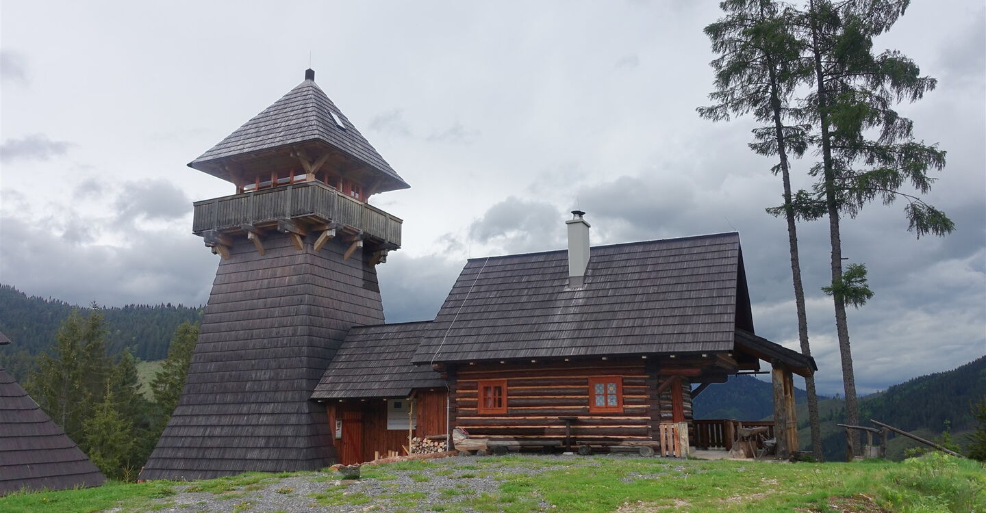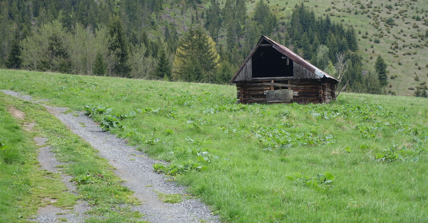 Nach kurzem Aufstieg sieht man bereits in der Ferne den Aussichtsturm 02 Rozhľadňa na Krajčovom vrchu (980 m). Nach einer Besichtigung gehen wir von dort auf einer Piste in westliche Richtung, rechts vorbei an drei verfallenen Ställen, wie sie überall auf den umliegenden Wiesen verstreut liegen – sie gehören zu den Besonderheiten der Region.