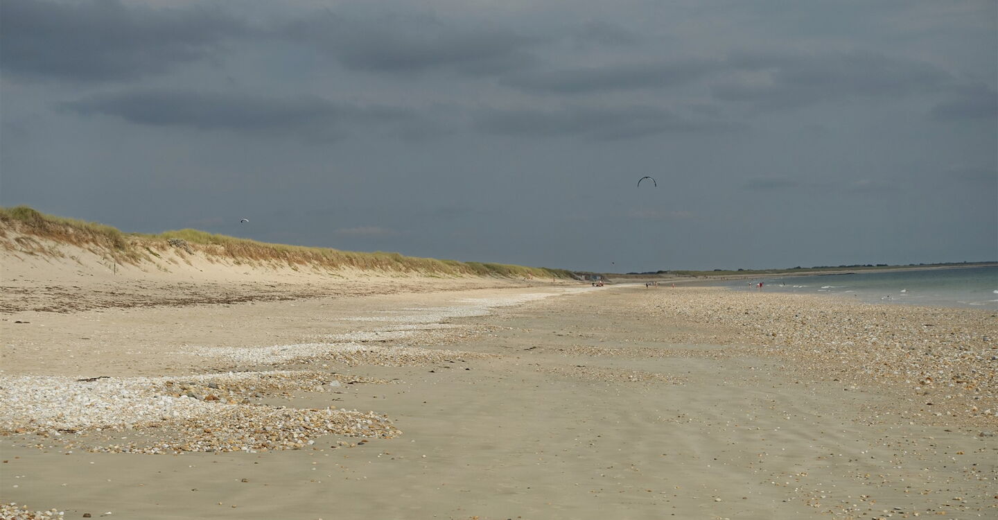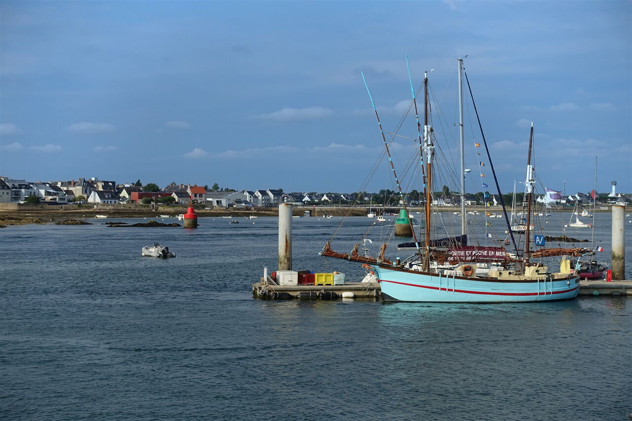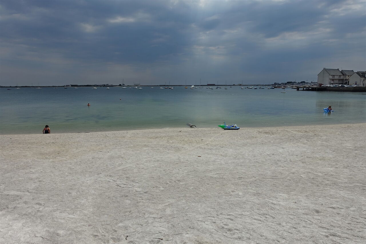 Es folgt ein langer und wunderschöner Strandspaziergang entlang der höchsten Dünen der Bretagne. Hinter einer langen Holzbarriere, die bis in das Meer ragt, gefolgt von einer Sanddüne, gehen wir direkt auf einen Steindamm zu. Wir haben die ersten Häuser der Ortschaft 05 Gâvres (2 m) erreicht. 285 m hinter dem Steindamm, bei einer Betonwand, verlassen wir den Strand über Treppen und gelangen auf einen Parkplatz. Wir gehen bis zur Hauptstraße vor, an dieser links und nach 80 m sofort rechts an der Steinmauer entlang. Am Pier gehen wir nun in nordwestliche Richtung bis zum Anleger, es folgt die Bootspassage.