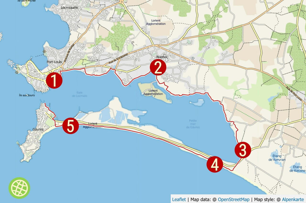 Vom 01 Start und Ziel am Port-Louis (2 m), gegenüber dem Hotel Avel Vor gelegen, gehen wir auf der Hauptstraße Richtung Leuchtturm. Kurz später verlassen wir die Hauptstraße in der Linkskehre und gehen in die Rue du Bastion mit 2,1 m Höhenbegrenzung. An der darauffolgenden Kreuzung gehen wir rechts und kommen an dem kleinen Stadtstrand vorbei. Hinter dem Leuchtturm und Waschsalon folgen wir dem rechten Abzweiger, auch ausgezeichnet mit Sentier Cotier. Entlang der Ufer des kleinen Meeres kommen wir an einem Parkplatz vorbei, gehen teilweise auf dem Küstenpfad und dann wieder direkt am Strand. Der teilweise stark verwachsene Pfad mündet in eine Straße, auf der wir rechts gehen. Gleich hinter der Brücke gehen wir dann rechts auf dem Pfad weiter.