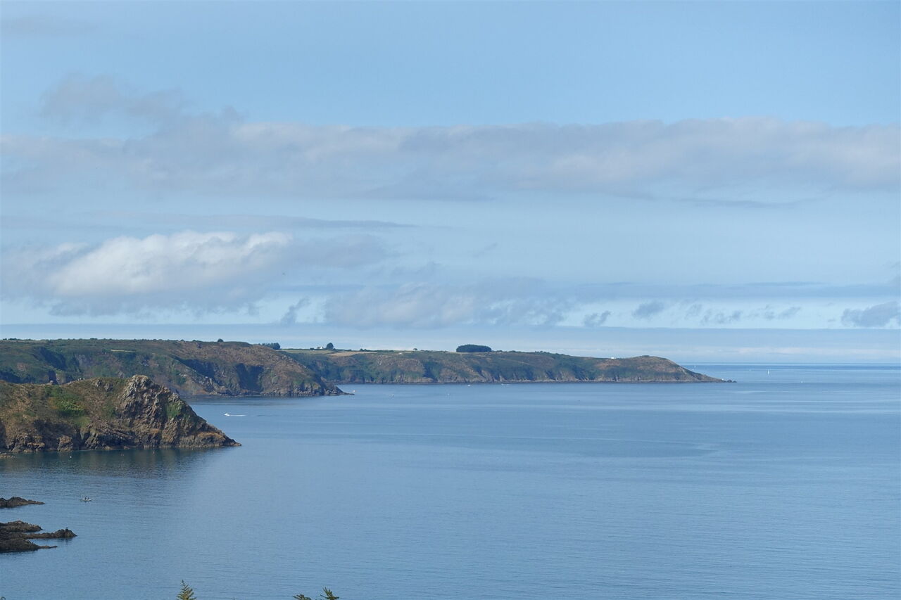 Bei der darauffolgenden Weggabelung gehen wir halb links und im weiteren Verlauf zunächst an Feldern entlang, dann durch ein kleines Waldstück und schließlich durch die Hortensienallee. Am Ende der Dreißigerzone – rechts geht es zur Pointe de Plouha – gehen wir geradeaus weiter. Dort, wo die Piste in die Straße mündet, gehen wir halb links. Sobald die Straße endet, gehen wir auf dem nachfolgenden Feldweg geradeaus weiter. Nach leichtem Abstieg gabelt sich der Weg, rechts geht es zum Plage Le Palus herunter, wir gehen halb links auf dem beginnenden Küstenpfad, dem GR 34. Nachdem wir mehrere steinige Buchten umlaufen haben, erreichen wir die 04 Pointe de Plouha (104 m), die höchste Klippe entlang der bretonischen Küste mit einem atemberaubenden Tief- und Fernblick.