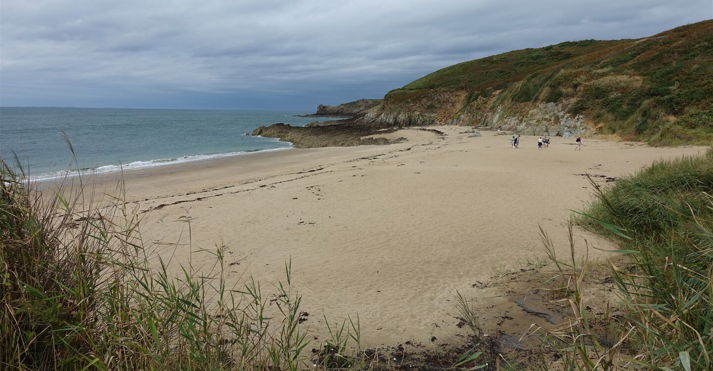 Nachdem wir die Pointe de la Mouliére hinter uns gelassen haben, erreichen wir den schönsten Strand auf der heutigen Wanderung, den 05 Plage du Verger (7 m) – ein 700 m langer und bei Ebbe 150 m breiter feiner Sandstrand. Auf dem Küstenpfad verlassen wir den Strand und erreichen einen Parkplatz. Dann setzen wir unsere Wanderung auf der nachfolgenden Straße bis zur Chapelle du Verger fort. Wir gehen rechts an der Kapelle vorbei und danach rechts auf einem Wirtschaftsweg weiter. Schließlich laufen wir direkt auf ein Haus zu, aber kurz vor dem Haus halten wir uns rechts. Sobald wir parallel zu einer etwas oberhalb liegenden Piste gehen, machen wir eine 180°-Kehrtwendung und folgen nun dieser Piste, die im weiteren Verlauf durch eine Senke, eine Linkskehre und eine Rechtskehre führt. Auf der Straße gehen wir bis zu deren Ende, dann gerade über die Straße und nehmen anschließend den weiterführenden Pfad. An dessen Ende gehen wir rechts und erreichen den Ausgangspunkt.