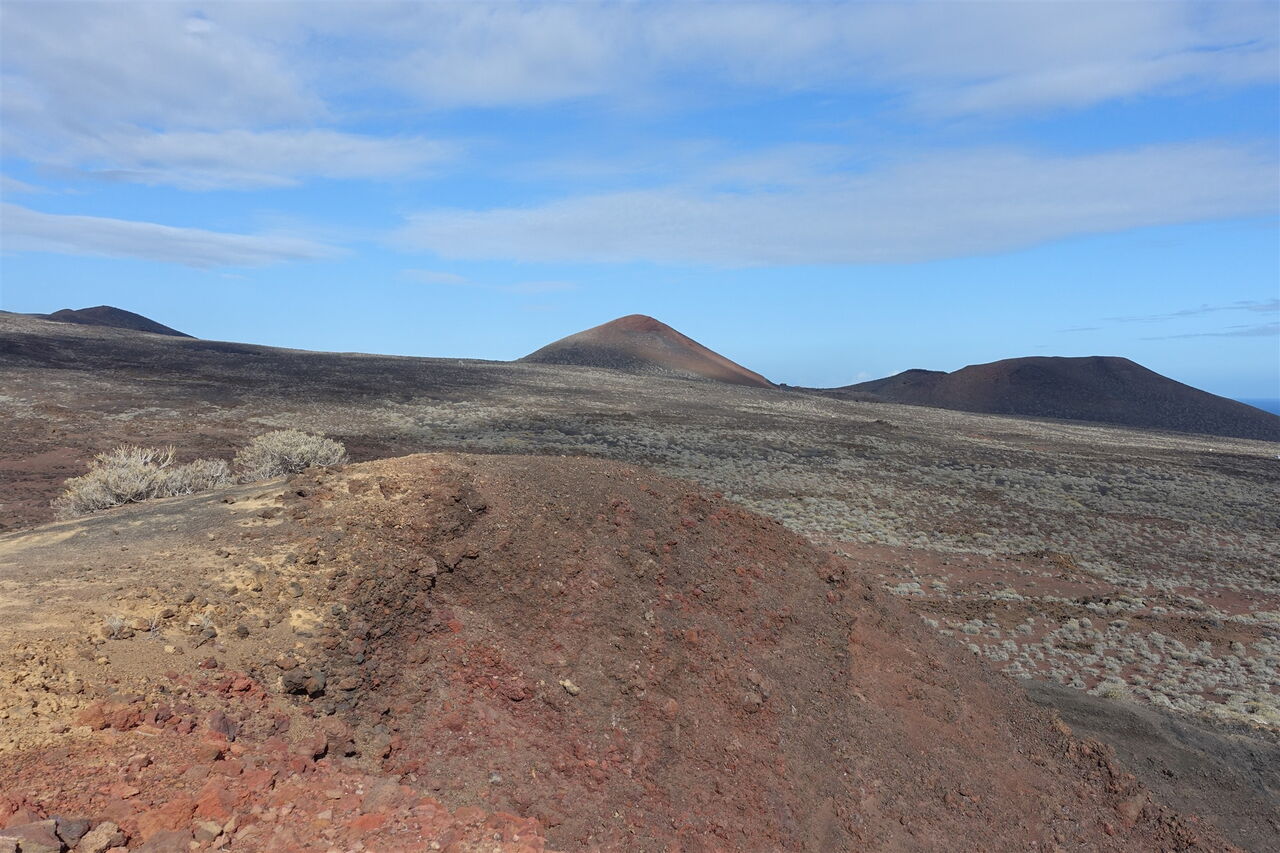 Wir gehen bis zur Straße (04) HI-4 (173 m) herunter und folgen dieser Richtung El Pinar, bis wir kurz hinter der Einsattelung auf eine kleine Betonsäule treffen, auf der die Nummer 12 geschrieben ist. Hier verlassen wir die Straße nach rechts und wandern zunächst durch die Senke bergab. Weglos und abschnittsweise auf Ziegenpfaden gehen wir direkt auf die Flanke des vor uns liegenden Vulkans zu. Weiter geht es parallel zu einer Trockensteinmauer, bis wir einen Mauerdurchbruch durchschreiten.