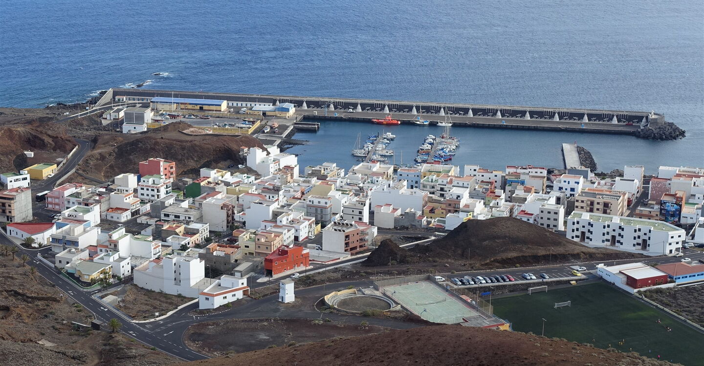 Von nun steigen wir auf Ziegenpfaden auf dem halb rechts von uns liegenden Bergrücken bis zum Gipfel der (05) Montana Restinga (209 m) auf. Dabei kann es sehr windig werden, denn die Passatwinde treffen ungebremst auf die ersten Hügelketten von El Hierro. Am Gipfel angekommen, schauen wir aus der Vogelperspektive auf das kleine Fischerdorf La Restinga. Zum Abstieg gehen wir weitere 70 m halb links auf dem Vulkankrater, um uns dann auf einem nicht so steilen, aber trotzdem gerölligen und rutschigen Untergrund in Richtung des rotbraunen Gebäudes zu orientieren, welches sich halb links unterhalb befindet. Kurz unterhalb des Gebäudes steht ein Strommast, bei dem wir auf einen Pfad Richtung La Restinga treffen. Dieser führt an der Bushaltestelle vorbei und auf einer der Straßen geht es bis zum Hafengelände herunter.