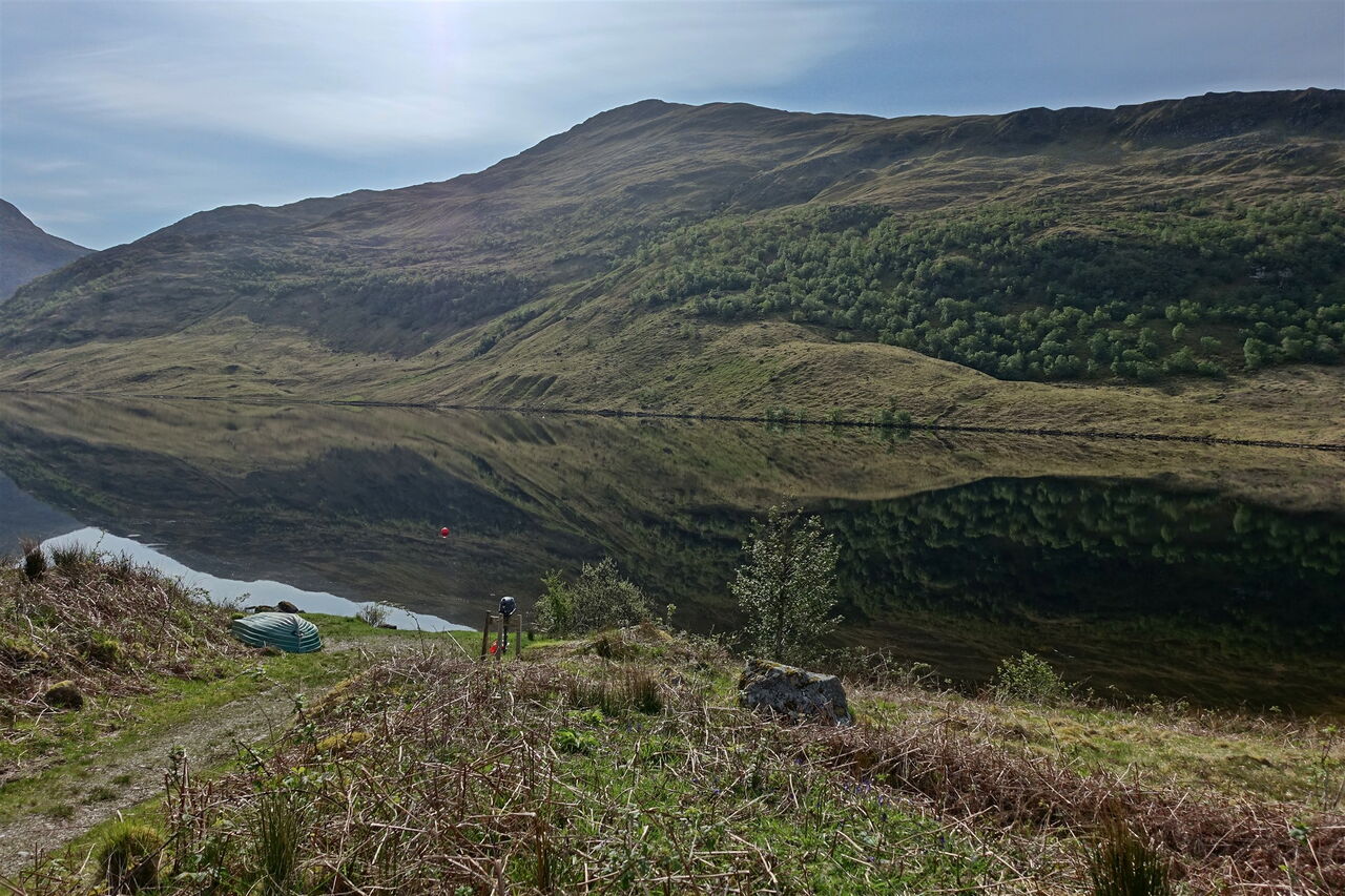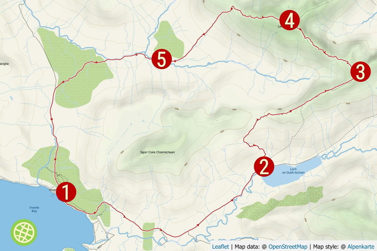 Hinter einer grünen Hütte erreichen wir den 02 Loch an Dubh-Lochain (62 m). Nach 6,75 km Zustieg beginnt nun die Bergtour. Hinter der Ruine führt noch ein kurzes Stück ein Pfad bergauf, dann ist kein eindeutiger Pfad mehr zu erkennen. Über Wiesen steigen wir steil und weglos auf und orientieren uns dabei an einem kleinen Bachlauf. Sobald wir in felsiges Gelände gelangen, weichen wir nach halb links aus. Sehen wir halb rechts ein weiteres Felsband, so queren wir unterhalb davon bis zur Einsattelung. Wir folgen dem faszinierenden schmalen Pfad auf dem Kamm Richtung Osten bis zu einer ersten Bergspitze auf 620 m Höhe.