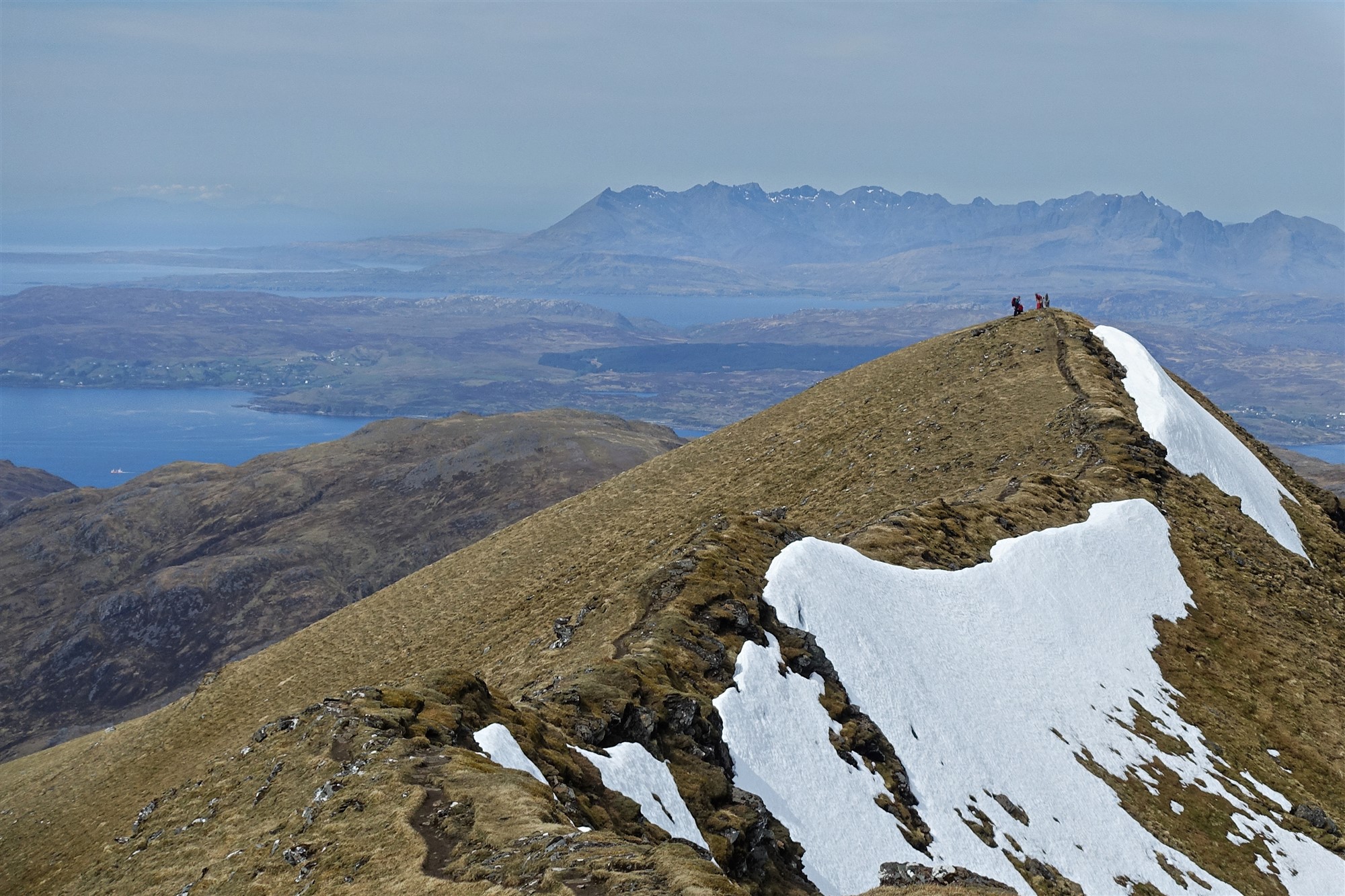 Über einen steilen Abstieg zu der Einsattelung Coire Dhorrcail folgen wir dem Pfad in nordwestliche Richtung. Danach folgt ein steiler Aufstieg, gelegentlich müssen die Hände zu Hilfe genommen werden und es gibt eine Kletterstelle mit dem Schwierigkeitsgrad 2. Hat der Ladhar Bheinn auf seiner südwestlichen Ausrichtung grasbewachsene Hänge, so tut sich unter seinem Gipfelgrat eine steile und zerklüftete Felswand, der sogenannten Coire Dhorrcail auf. Ein nun klar definierter Pfad führt zu dem größtenteils grasbewachsenen Grat hinauf und zum Gipfel des 04 Ladhar Bheinn (1020 m). Es gibt sensationelle Ausblicke entlang des Berggrats bis zu einem Trigonalpunkt, über die Weite des Meeres, zu den Cuillins auf der Insel Skye und rechts hinunter zur Barrisdale Bay und zum Loch Hourn.