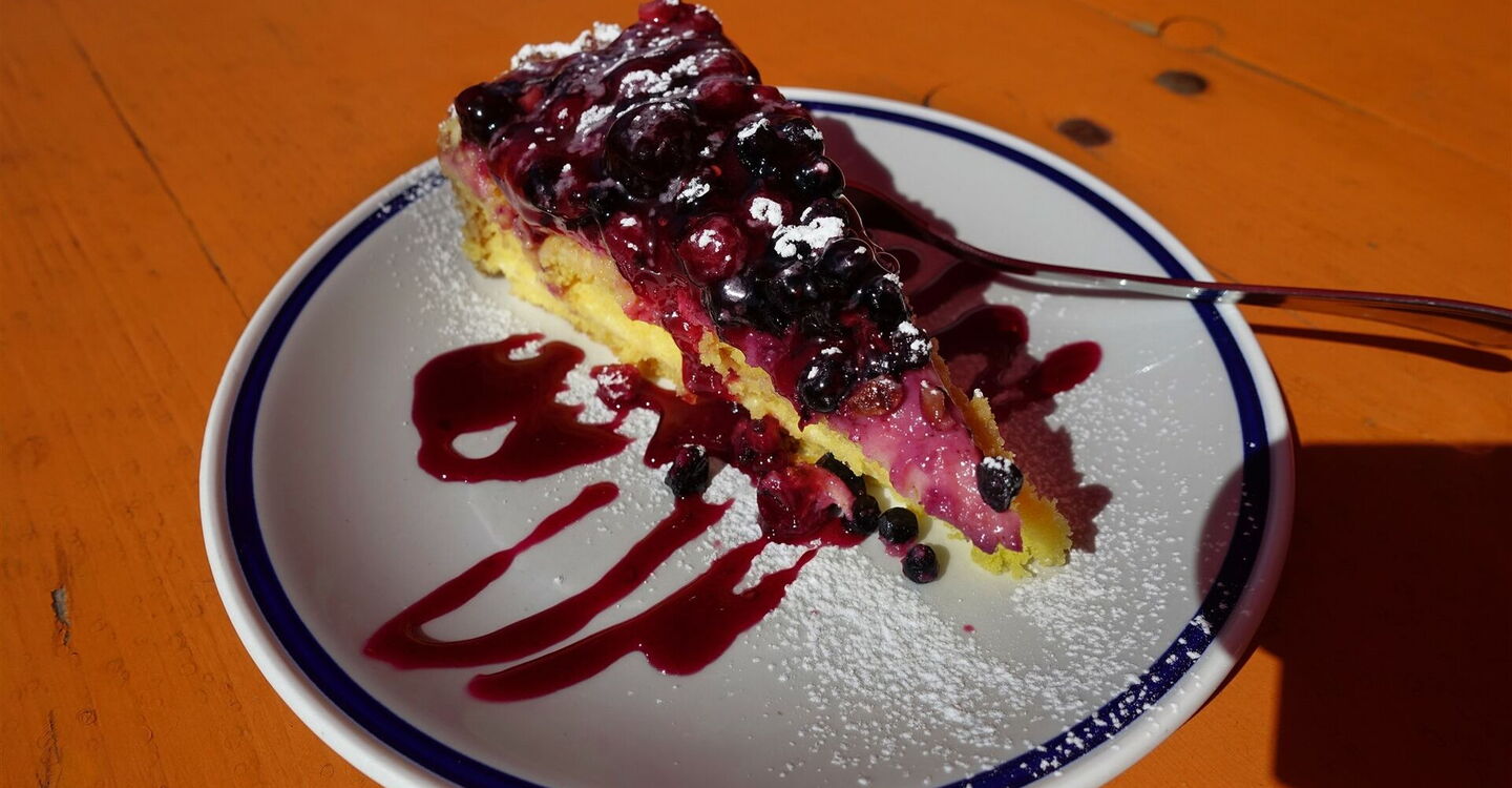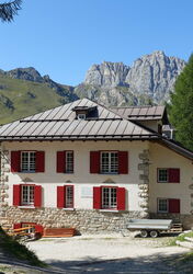 Wir befinden uns jetzt auf einem alten Maultierpfad, der seit Mitte des 18. Jahrhunderts genutzt wurde, um die Touristen dichter an die Marmolata heranzubringen. Den rechten Abzweiger hinter einer Hütte ignorieren wir. Nach mehreren Heiligenschreinen mündet der Pfad in eine asphaltierte Zufahrtsstraße, wir erreichen die 02 Albergo Viletta Maria (1.664 m). Hinter der nächsten Brücke verlassen wir die Straße bereits wieder nach links, auf dem Forstweg geht es weiter bergab.