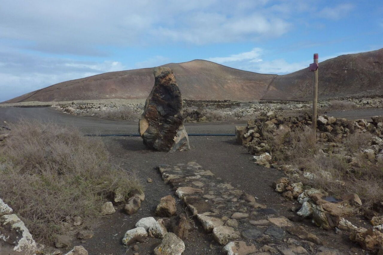 In östliche Richtung führt ein Pfad weg vom vereinzelt stehenden Gebäude, vorbei an brachliegenden Feldern, zu einem markanten aufrecht stehenden Felsen, den man schon aus der Ferne ausmachen kann. Wenn wir an diesem Stein auf der Schotterpiste links gehen, gelangen wir nach Corralejo. Wir gehen aber rechts in (04) Richtung Lajares (189 m). Nach 1,2 km auf der Schotterpiste gehen wir bei der folgenden Weggabelung erneut rechts. Nach weiteren 700 m verlassen wir den Hauptweg und gehen nun halb rechts auf dem Nebenweg weiter.