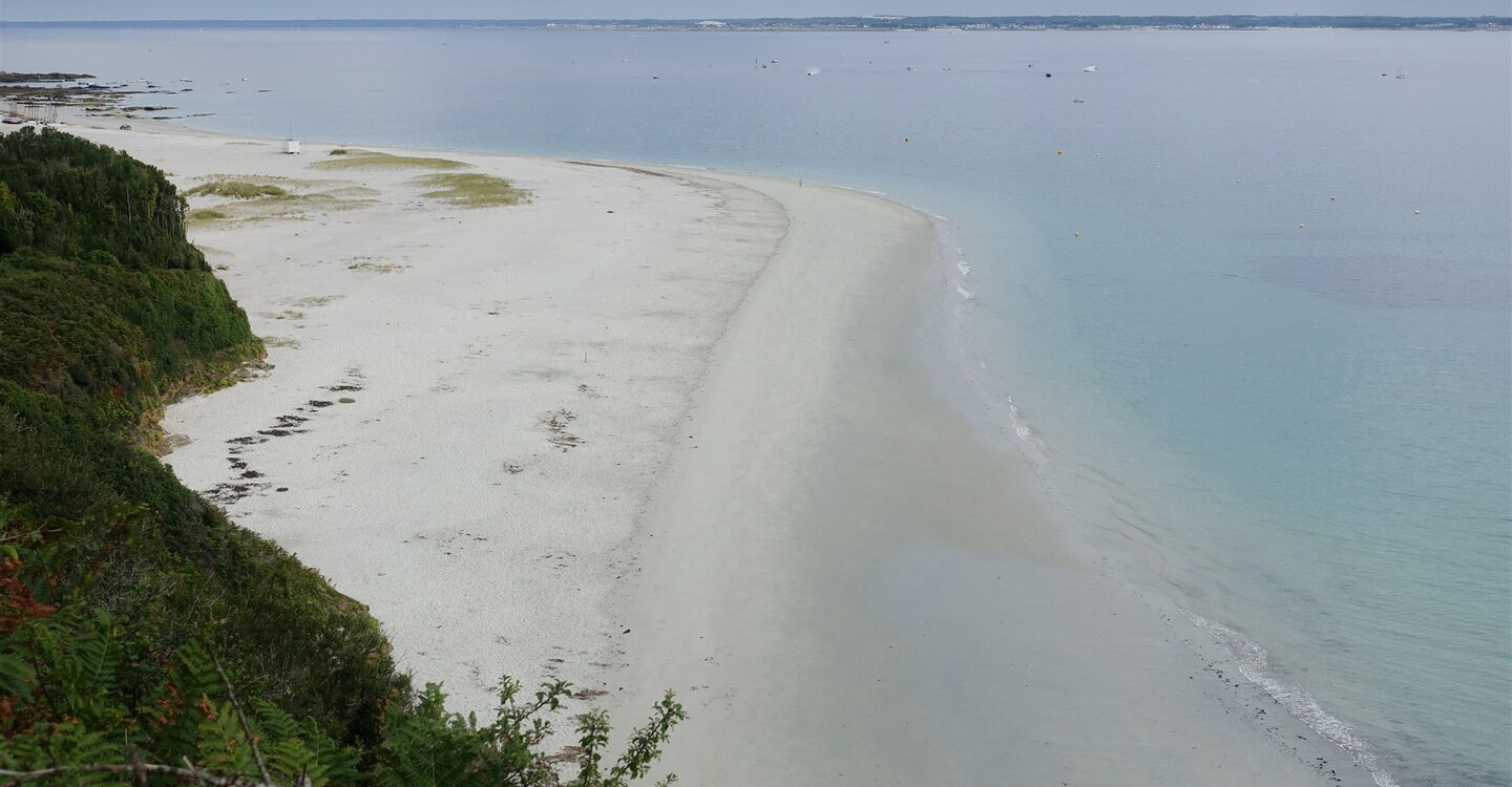 Nun ständig auf dem Küstenpfad bleibend, gehen wir in Richtung des Leuchtturms an der 04 Pointe des Chats (10 m). Bei guter Fernsicht kann man in südöstlicher Richtung die Halbinsel Quiberon und die Insel Belle-Île ausmachen. Von dem Leuchthaus, das schon etwas in die Tage gekommen ist, gehen wir nun in nordwestlicher Richtung auf dem Pfad entlang der Küste. Wir umlaufen zunächst eine kleine Bucht, um dann die Bucht des kleinen Fischerdorfes Locmaria auf einem etwas erhöht liegenden Pfad zu queren. Am Ende der Bucht, hier befindet sich eine nach links abzweigende Straße, biegen wir rechts auf den beginnenden Pfad ab.