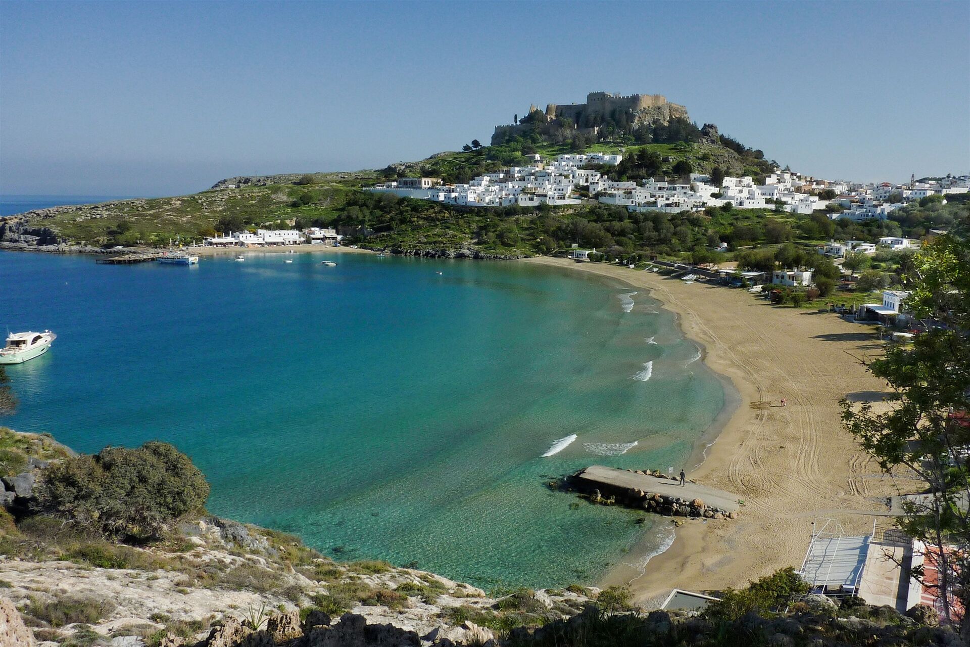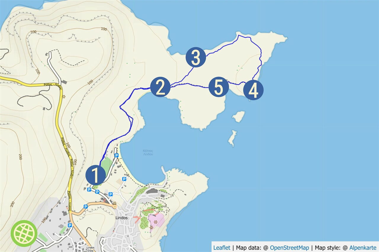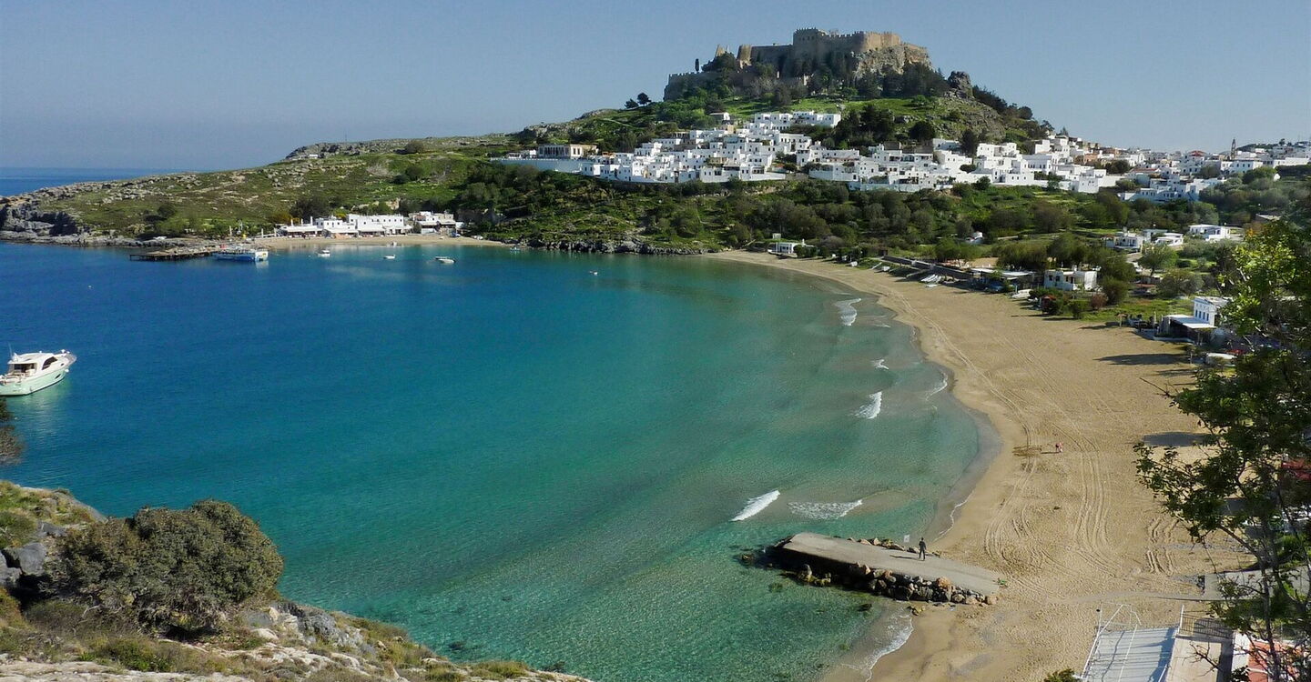 Ein besonderes Highlight unter den Sehenswürdigkeiten auf Rhodos ist das weiße Häusermeer mit seinen romantischen Dorfgassen, künstlerisch gestalteten Portalen und der altgriechischen Akropolis; die Rede ist von Lindos, dem Ausgangspunkt der Wanderung. Verlaufen kann man sich nicht, denn man hat den Felsenhügel mit der kreisförmigen Grabstelle immer im Blick. Von dort oben ergeben sich die schönsten Ausblicke auf Lindos, die Bucht von Lindos und die dahinter liegende, wieder aufgebaute Johanniterburg. Eine Genusswanderung am tiefblauen Meer entlang ohne körperliche Anstrengungen.