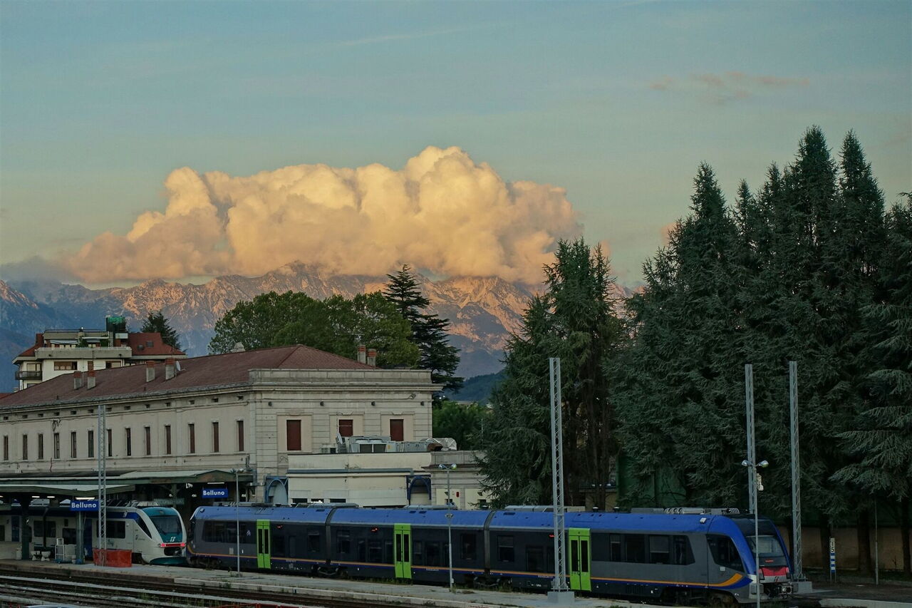 Links vom nachfolgenden Kreisverkehr gehen wir über den Zebrastreifen, dann einige Meter rechts, um schließlich links auf einen Weg durch eine Grünzone zu gelangen. An dessen Ende gehen wir einige Meter rechts und sofort links, nun wieder entlang einer Straße. Die nachfolgende Hauptstraße überqueren wir über die Fußgängerbrücke und gehen dann links entlang der Hauptstraße, um anschließend rechts über Treppen und eine Unterführung zum Busbahnhof und zur Bahnstation 05 Stazione Belluno (429 m) zu gelangen.