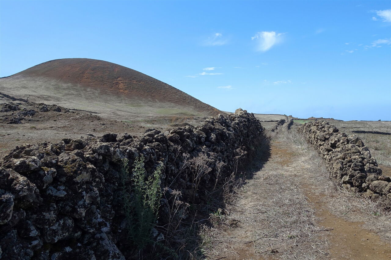 Bei einem Felsen angekommen, ergibt sich ein gigantischer Blick in das 1000 Höhenmeter tiefer liegende Halbrund des El-Golfo-Tals. Es folgt der spektakulärste Teil der Wanderung, die (03) Gratwanderung (1100 m) oberhalb des Risco de Tibataje – definitiv nichts für schwache Nerven. Naja, Trittsicherheit und Schwindelfreiheit – das muss an dieser Stelle noch einmal gesagt werden – sind essenziell. Gleich auf dem ersten Abschnitt müssen wir den ursprünglichen Pfad umlaufen, denn dieser ist nach einem Erdrutsch nicht mehr vorhanden. An vielen Stellen ist der Pfad am Abgrund stark verwachsen, so kann man über die Trockensteinmauer steigen und auf den Feldern und Wiesen parallel zum Abgrund gehen.