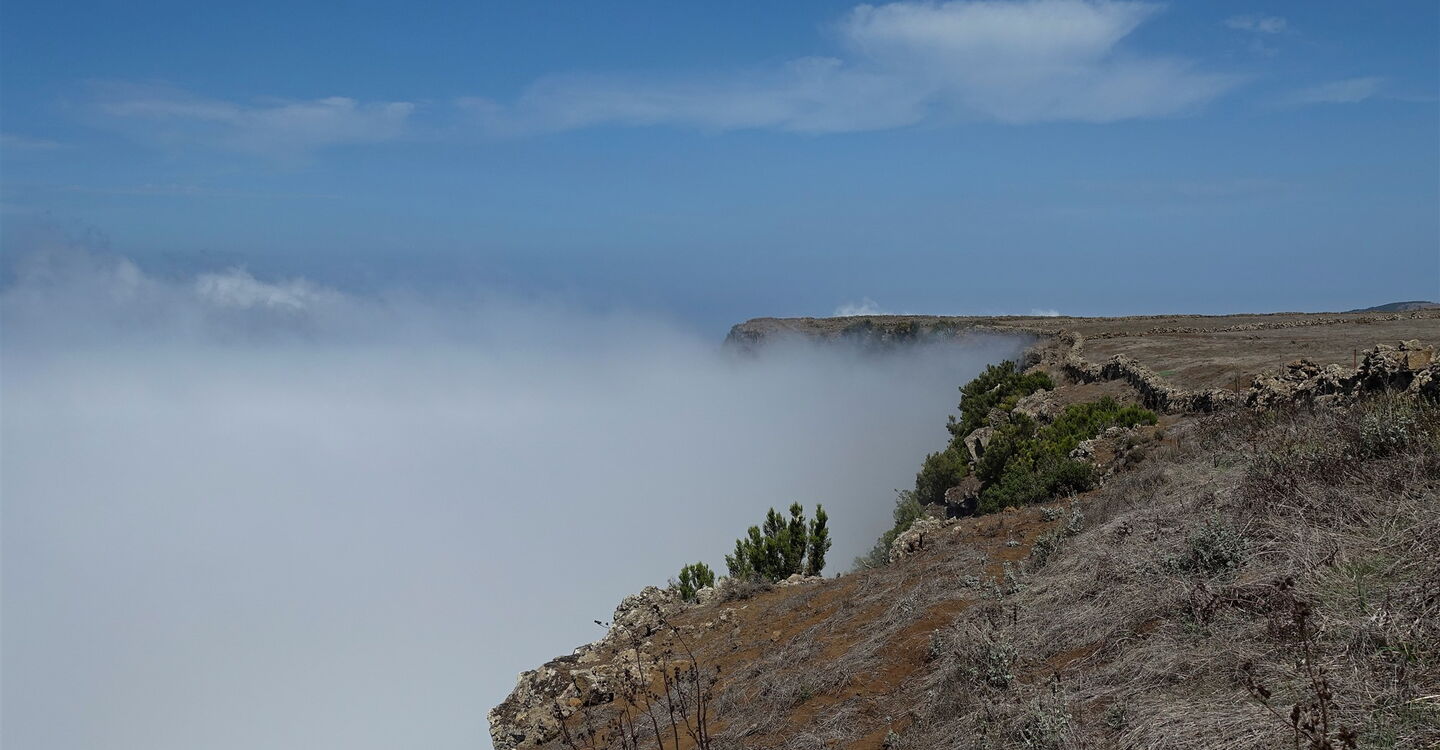 Die Meseta-de-Nisdafe-Hochebene ist in ihrem Wechselspiel aus verdorrtem Land in den Sommermonaten und fruchtbaren sattgrünen Weiden im Winter und im Frühjahr einmalig auf den Kanarischen Inseln. Sie liegt im Einflussbereich der Passatwolken, die zusätzlich in den Wintermonaten der Landschaft etwas Mystisches verleihen. Geht man in diesem wunderbaren Wandergebiet noch am oberen Rand einer 1100 m steil abfallenden Felswand, so sind dies die perfekten Zutaten für eine der erlebnisreichsten Wanderungen auf El Hierro. Ein Weg der Langsamkeit, um all die Eindrücke und Gedanken zu ordnen.