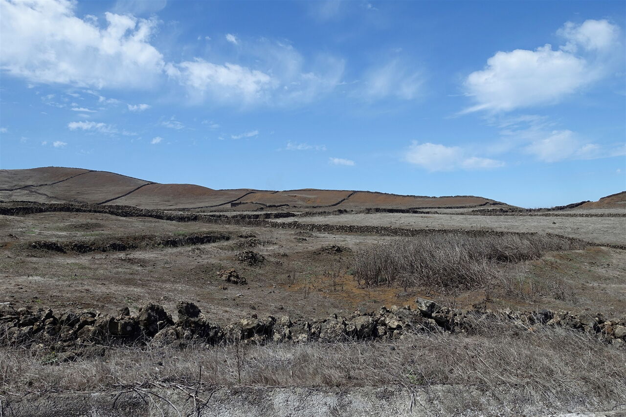 Vom (01) Start und Ziel (945 m) gehen wir auf der Anfahrtsstraße weiter, um nach 210 m halb rechts auf der Asphaltstraße weiterzugehen. Es geht direkt über die Hochebene, vorbei an einem Meer aus Feldern und Wiesen, eingefasst von riesigen Trockensteinmauern. Je nach Saison besiedeln Kühe, Pferde, Ziegen, Schafe und Esel die Wiesen.