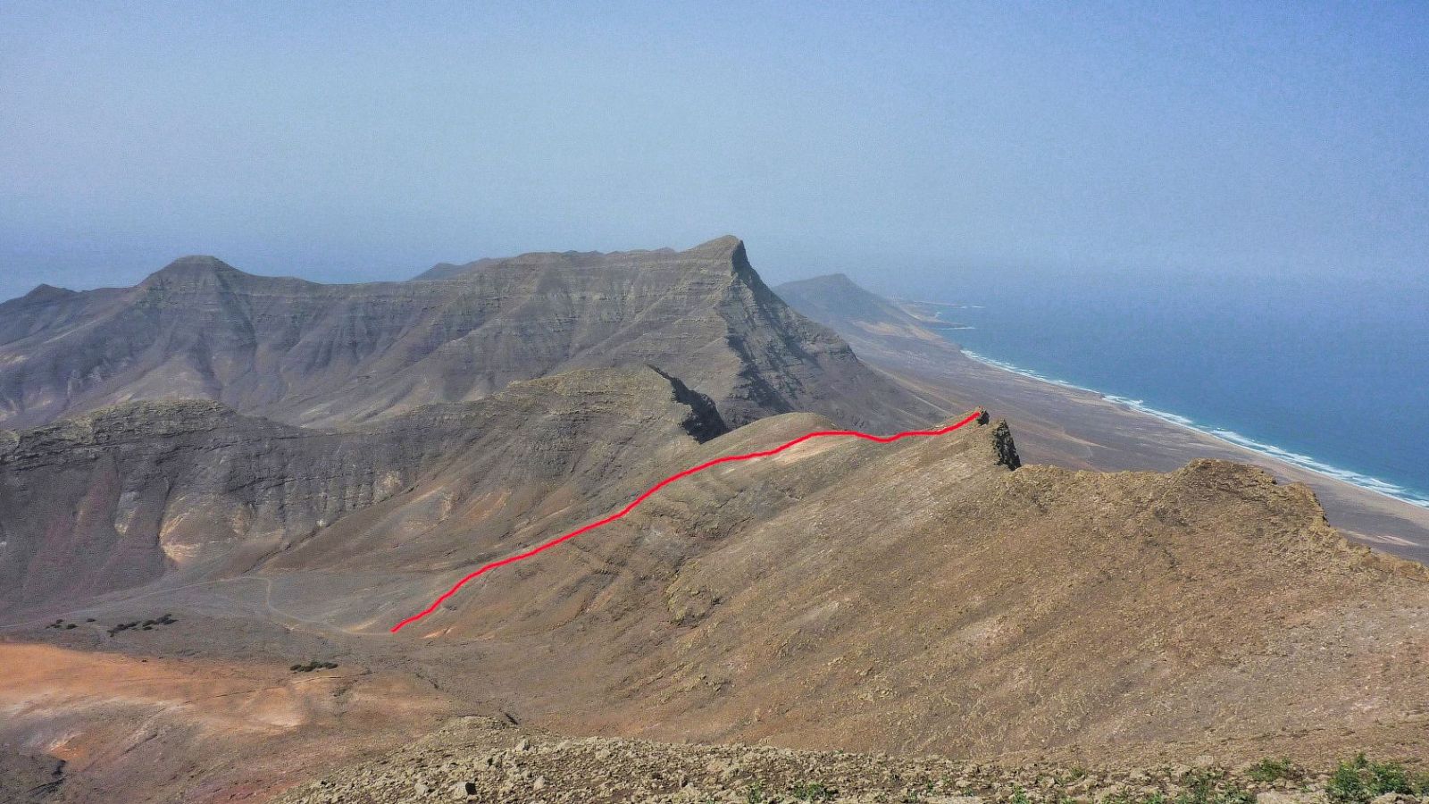 Der Weg wird nun zunehmend steiler und rutschiger, bis wir am Grat angekommen sind und auf den 521 m tiefer gelegenen (03) Playa Cofete (521 m) herunterblicken. Sogar die rätselhafte Villa Winter lässt sich sehr gut ausmachen. Der Deutsche Ingenieur Gustav Winter baute an dieser sehr einsamen und zudem noch schlecht zugänglichen, aber überaus beeindruckenden Stelle von Fuerteventura ein imposantes Haus. Dies geschah genau während des Zweiten Weltkrieges!
