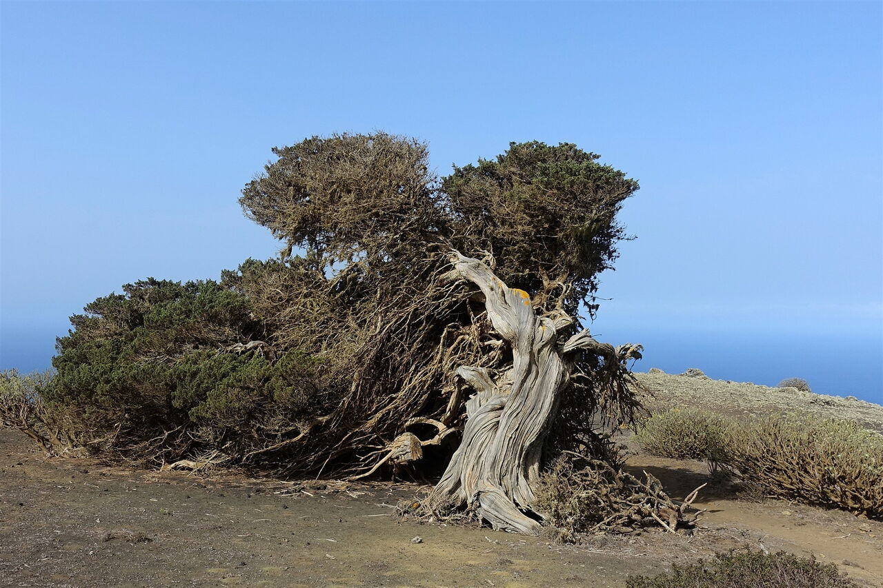 Wir erreichen den König aller (04) El Sabinar (601 m) – man schätzt sein Alter bis zu 1000 Jahre. Ab 9:30 Uhr ist die Sonne über die Berggipfel gestiegen und man hat sie im Rücken, um den König im vollen Glanz abzulichten. Wir nehmen dieselbe Strecke wie auf dem Hinweg bis zum Mauerdurchbruch.