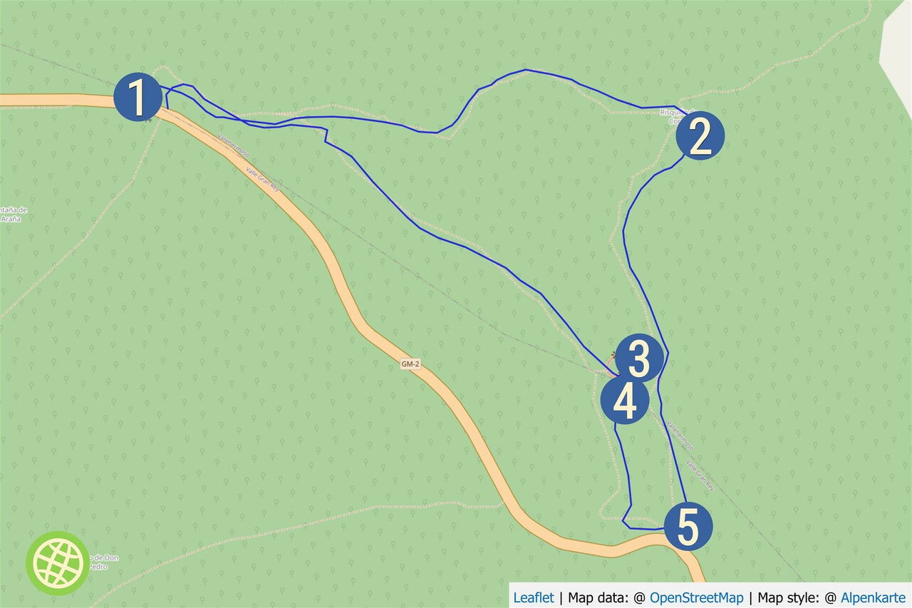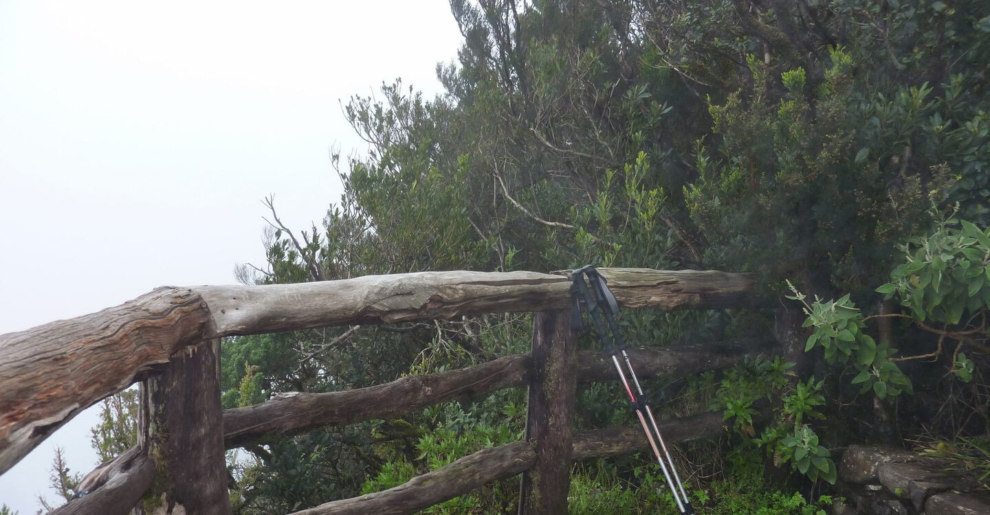Beim (01) Start und Ziel (1083 m) gehen wir über die Hauptstraße hinüber zum Picknickplatz und von dort auf dem beginnenden Pfad leicht bergauf Richtung Las Creces, zunächst parallel zur GM-2. Bei der folgenden Weggabelung halten wir uns links. Nun geht es leicht bergab tiefer in den Nebelwald hinein.