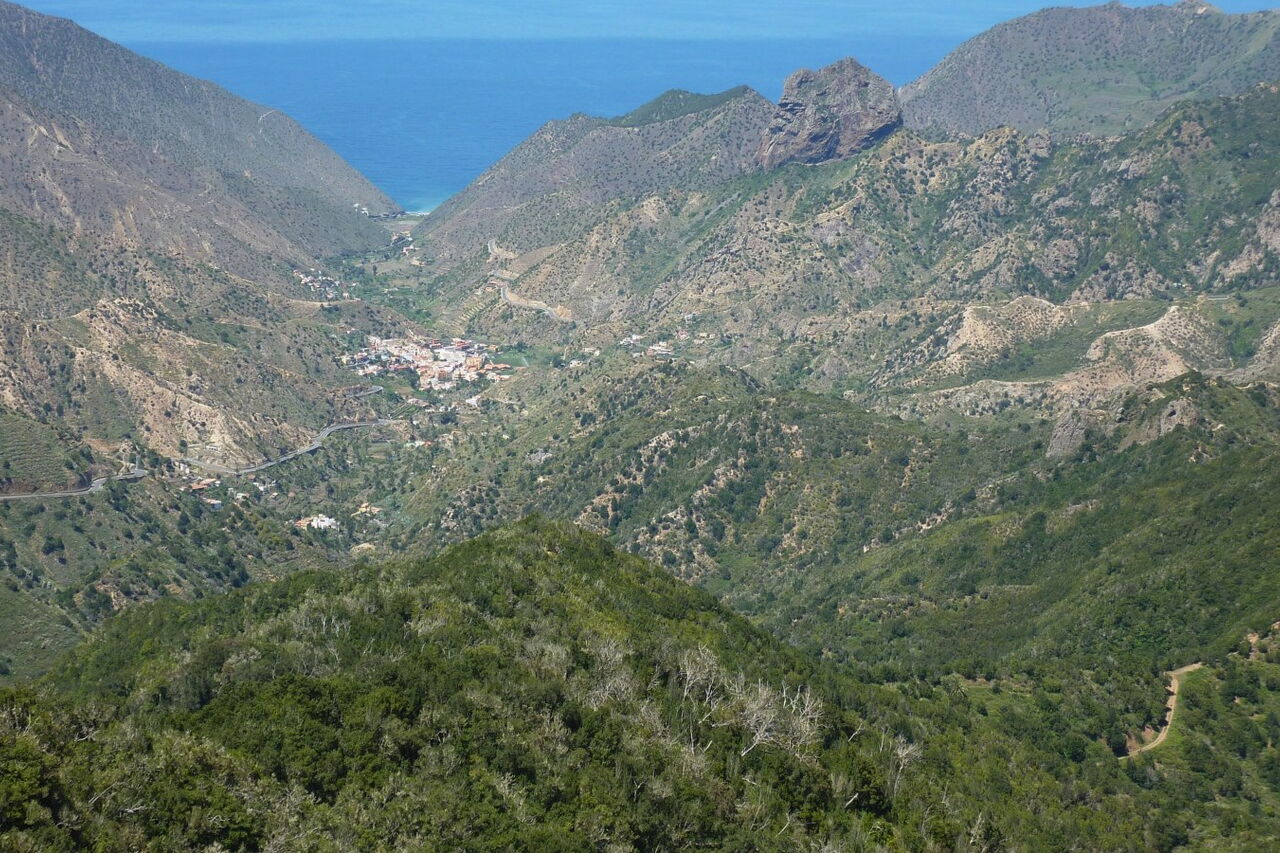 Der Glückliche erwischt einen der wenigen wolkenlosen Tage, an denen man vom (05) Mirador (1123 m) eine wunderbare Sicht auf Vallehermoso und den Roque de Cano bis hin zum Atlantischen Ozean hat. Wir gehen die 40 m bis zum Hauptweg zurück, um nun rechts durch den Wald bis zum Ausgangspunkt zurückzulaufen.
