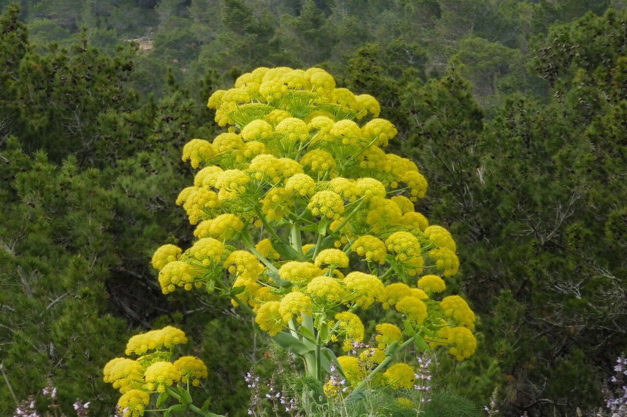 Vor einem Olivenhain treffen wir auf eine (02) Weggabelung (240 m), hier gehen wir links und nach 40 m sofort rechts, an den Weinreben vorbei und auf ein Waldstück zu. Nach einem Ziegengatter führt ein Pfad über einen Bergrücken bergab. Steinmännchen helfen bei der Orientierung durch die flach gewachsenen Sträucher und die Felsen.
