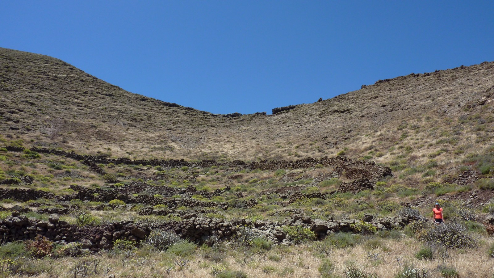 Die Schotterstraße macht eine scharfe Linkskurve und nach 120 m geht es vorbei an der links von uns liegenden Ruine. Noch vor dem Barranco gehen wir rechts und für kurze Zeit weglos auf die nordöstliche Öffnung des Vulkankraters zu. Wenig später ist wieder ein Pfad zu erkennen. Bei einem Durchbruch passieren wir eine Steinmauer. Nachdem wir den Vulkangrund halb rechts durchschritten haben, gehen wir an der hohen Steinmauer entlang. Der Weg ist nicht immer eindeutig ersichtlich. Hinter der Steinmauer beginnt ein Pfad, auf dem wir bis zu einem gut sichtbaren (03) Felsdurchbruch (300 m) aufsteigen.