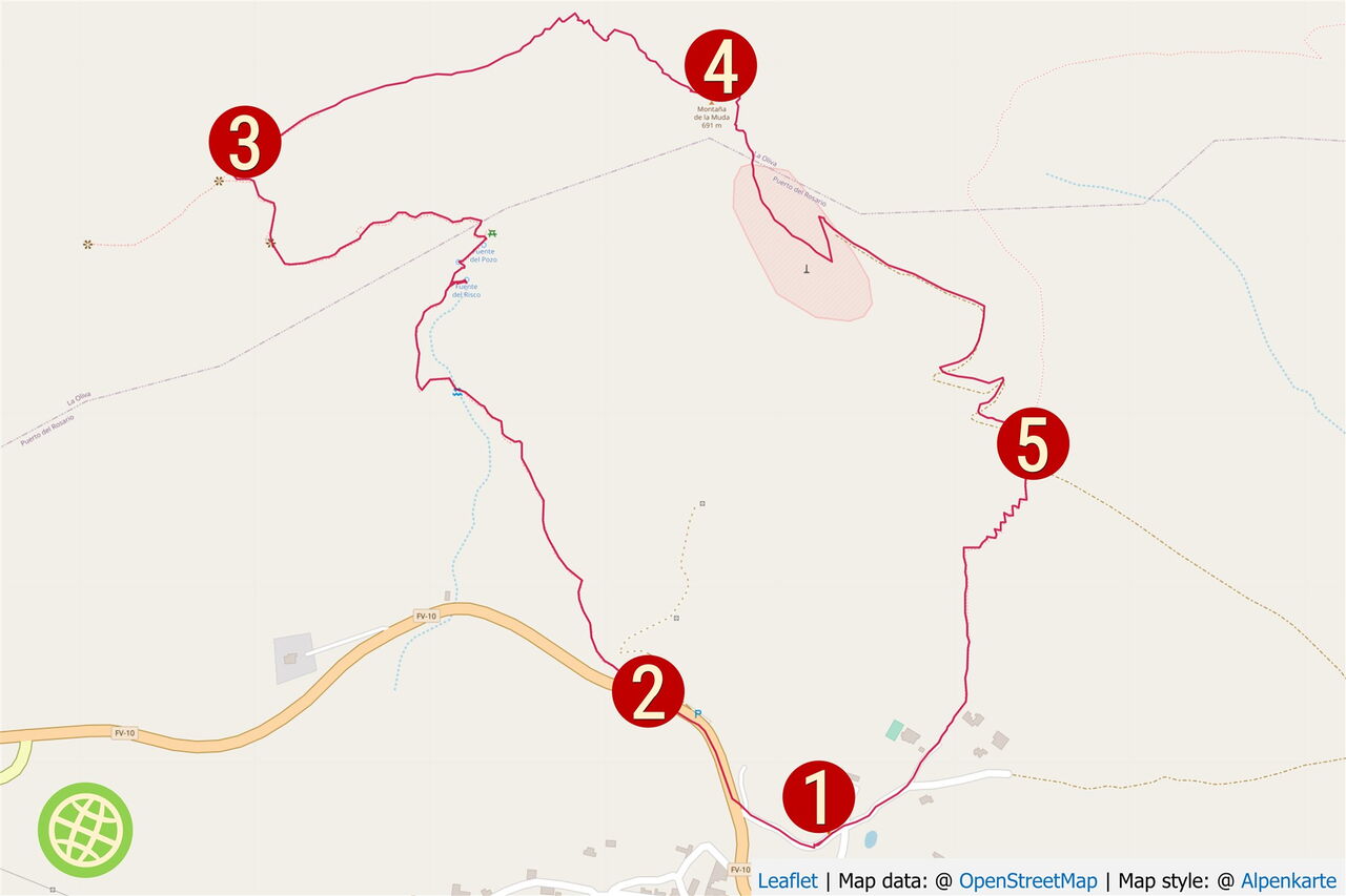 Vom (01) Start und Ziel (336 m) gehen wir 130 m bis zur Hauptstraße vor, um dort rechts die Straße Richtung La Olivia zu nehmen. Diese verlassen wir nach 200 m rechts bei einer Informationstafel. Im Anschluss passieren wir die Nordwestflanke der Montana La Muda durch verlassene Felder.