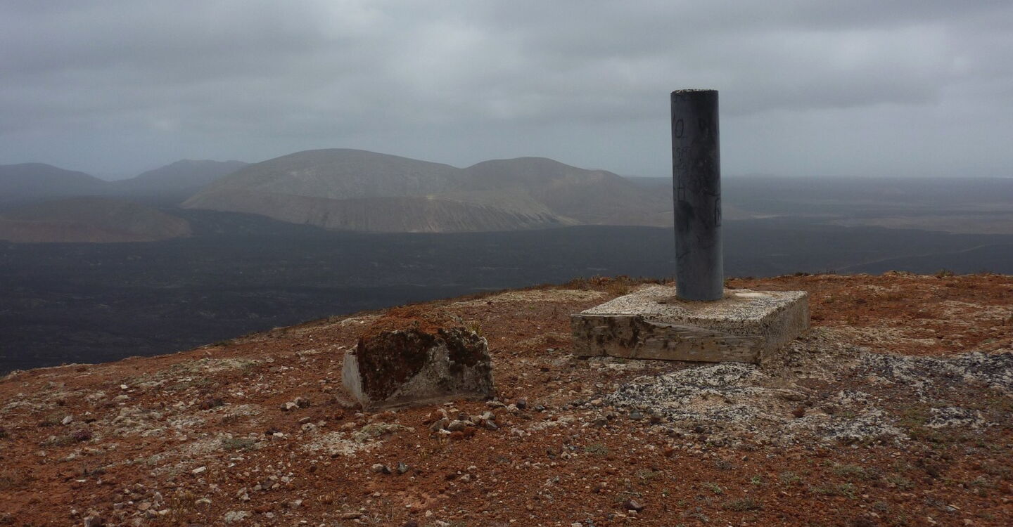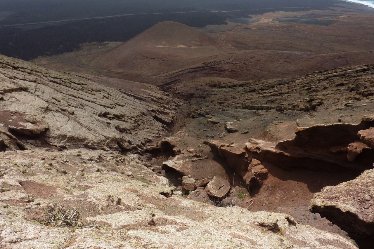Im oberen Teil der Durchschreitung teilt sich das Barranco abermals. Hier gehen wir zunächst rechts - weil der Weg einfacher ist -, aber nach einigen Metern gehen wir durch den linken Barranco-Arm weiter. Verschiedene Steinfarben und Impressionen lassen uns eine Weile verharren. Nach weiteren 500 m verlassen wir das Barranco und werden auch prompt von dem in der Regel stark wehenden Nordost-Passat erfasst. Wir lassen noch die restlichen Meter zum Gipfel der (03) Montaña de Teneza (368 m) hinter uns. Schaut man von hier aus Richtung Süden, kann man sehr schön erkennen, wie sich die Lava bei den Ausbrüchen von 1730-1736 ihren Weg Richtung Meer gebahnt hat. Wie mit einem Lineal gezogen, trennt eine imaginäre Linie die kultivierten Flächen vom Lavastrom. In südwestlicher Richtung thront der Krater Caldera Blanca.