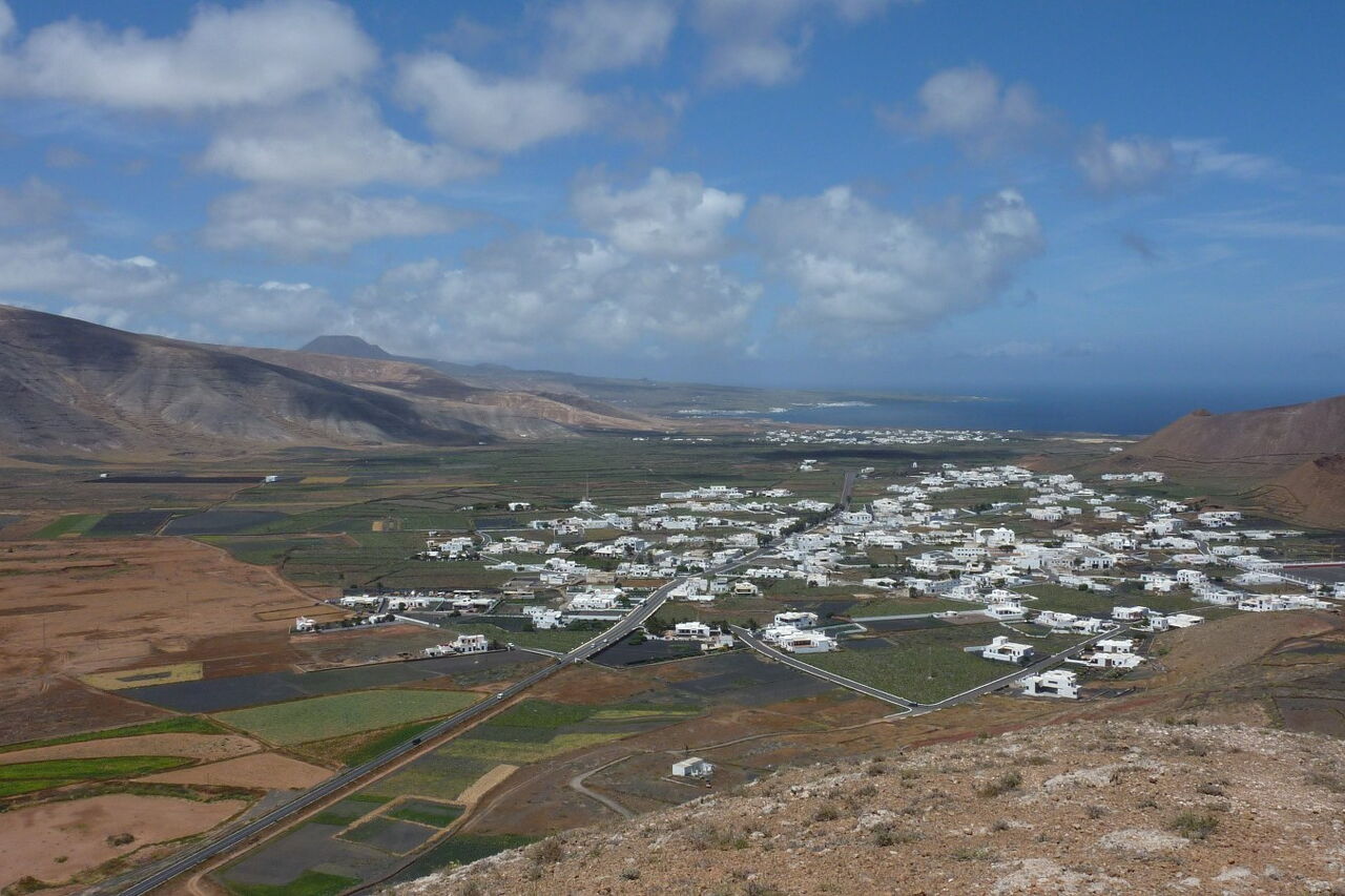 An dieser Stelle verlassen wir den Hauptweg nach rechts in den Hang. Dabei steigen wir links vom Loch, weglos in Kehren, bis auf den Gipfel der (05) Montaña de Guenia (358 m). Im weiteren Verlauf führt der Pfad auf dem Grat entlang, bis wir in den offenen Vulkankessel schauen können. Links auf dem Grat führt ein Weg in den Vulkangrund, aber wir gehen rechts auf dem Grat entlang, um dann steil und weglos abzusteigen. Wir treffen auf eine Schotterpiste und gehen diese links durch ein Barranco. Nach einer Rechtskehre erreichen wir die Asphaltstraße. 250 m später verlässt ein Pfad die Asphaltstraße nach rechts zu einem Gebäude, um anschließend wieder auf die Asphaltstraße zu gelangen. Vorbei geht es am Friedhof, in Kehren bergab, über die LZ-1, um dann zum Start und Ziel in Guatiza zu gelangen.