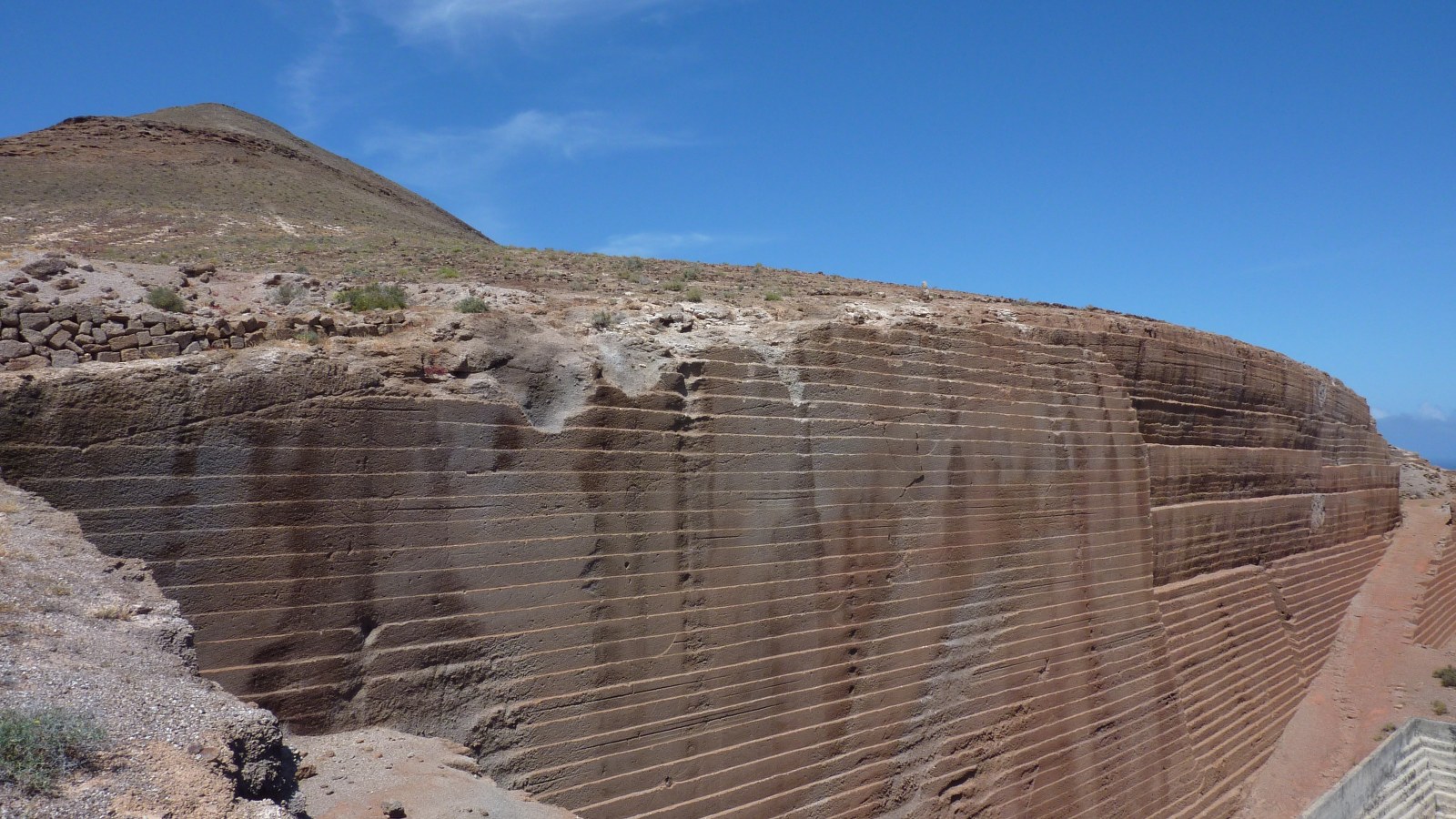 Kurz hintereinander folgen zwei Weggablungen. Bei der ersten gehen wir links und bei der zweiten rechts. Der Weg führt nun leicht bergauf, vorbei an bis zu 20 m hohen Wänden aus dunklem, feinkörnigem Eruptionsgestein. Wir wandern nun stetig bergauf, ignorieren einen Abzweiger nach links und einen nach rechts und gehen nun direkt am Fuße der Montaña de Guenia, bis wir die (04) Schlüsselstelle (251 m) erreichen. Die Steigung der Schotterpiste ist geringer geworden und links vom Hauptweg zweigt eine weitere Piste ab. Rechts von uns, im Hang, ist die Erde abgerutscht, wodurch ein 40 × 50 m großes Loch entstanden ist.