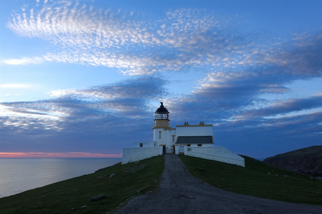 Wir gehen in südliche Richtung auf einem schwach ausgeprägten Bergrücken – der Pfad ist aber gut zu erkennen –, bis wir halb links in der Ferne eine Schotterpiste sehen. Wir queren zu dieser herüber und gehen auf ihr bis zum Parkplatz beim Ausgangspunkt zurück. Es empfiehlt sich noch ein Abstecher zum oberhalb gelegenen 05 Leuchtturm Stoer (58 m). Er wurde 1870 erbaut, sendet alle 15 Minuten ein Leuchtfeuer und hat eine Reichweite von beachtlichen 43 km.