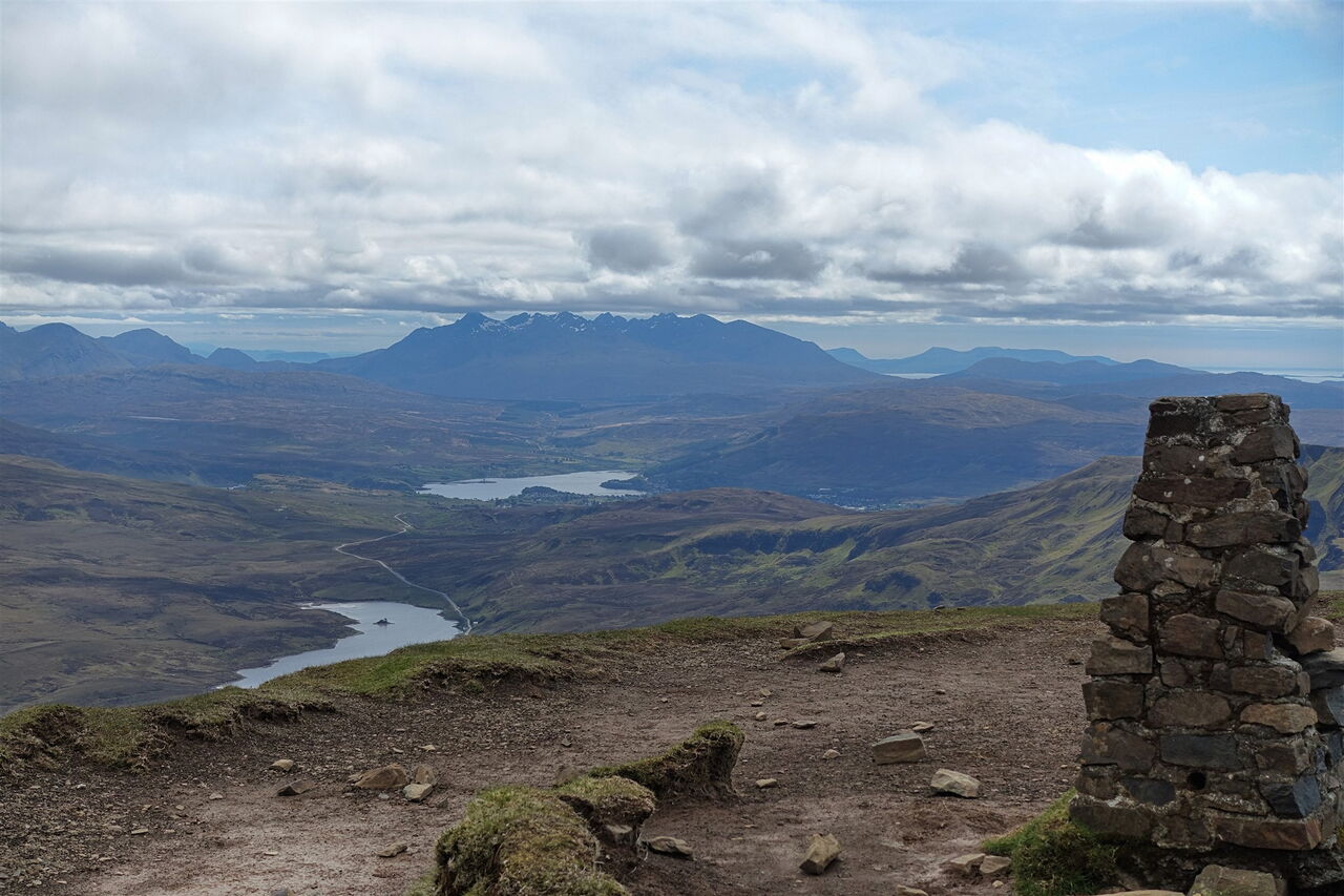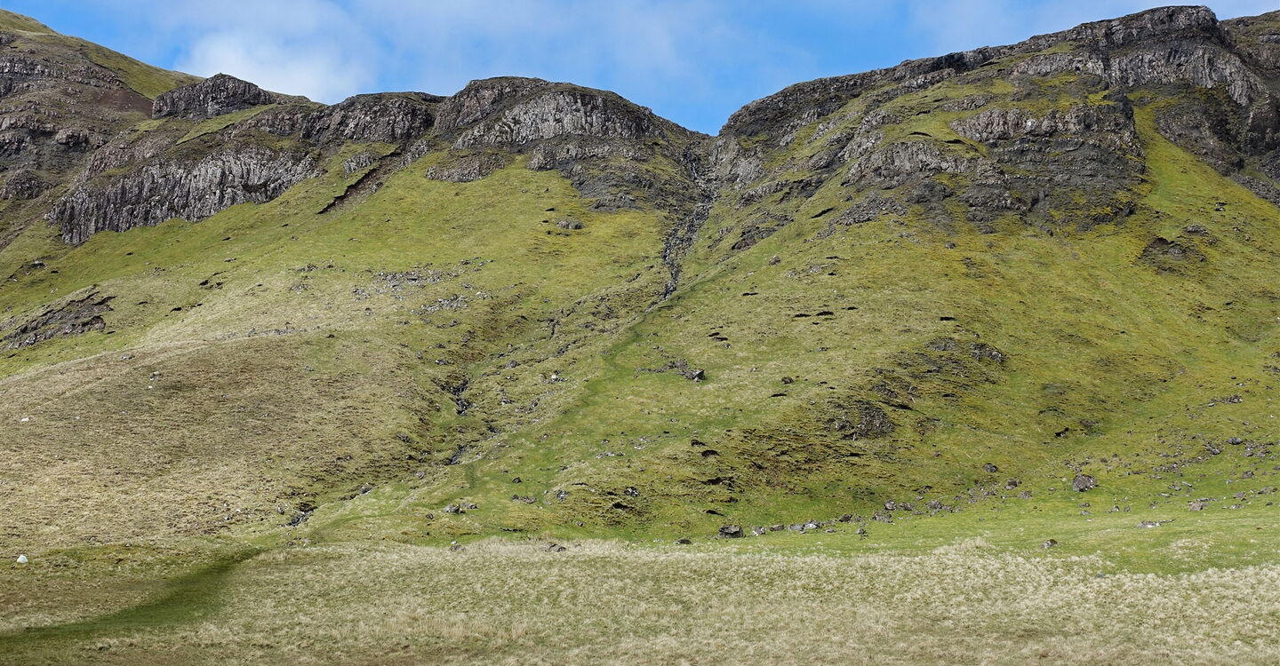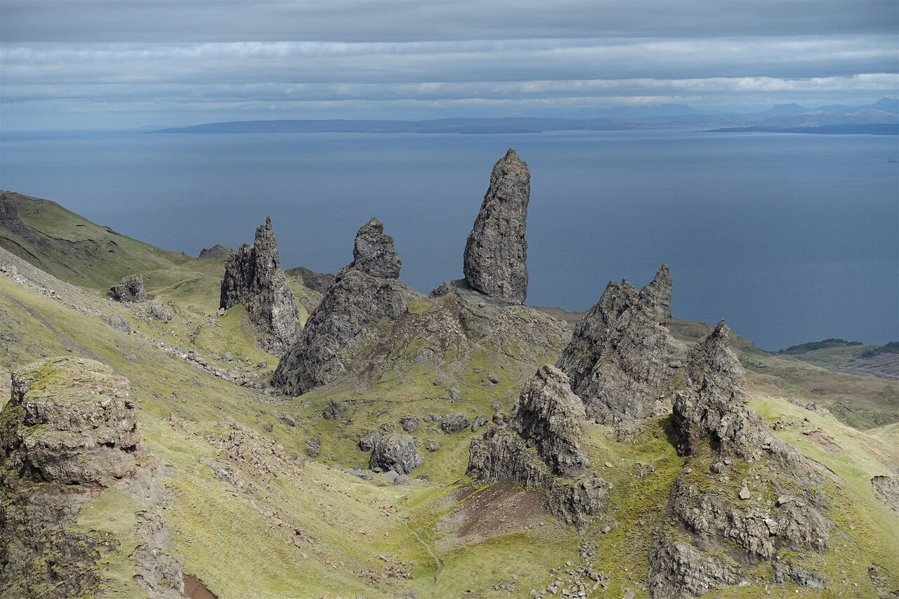 Dieser führt nun spektakulär entlang der Abbruchkante des mächtigen Erdrutschs vor 15.000 Jahren und gewährt faszinierende Tiefblicke auf den Old Man of Storr und seine Kinder. Während sich unterhalb an schönen Tagen die Touristenscharen drängen, steigen wir im Alleingang auf Grashängen bis zum Gipfel des 03 The Storr (719 m) auf. Während die felsige Ostseite des Gipfels gut 300 Höhenmeter senkrecht abfällt, sind das Gipfelplateau sowie seine Ostseite dagegen unspektakulär, leicht abfallend und mit Gras bewachsen. Ja, das Grün ist so kurz gehalten, dass man es als "Englischen Rasen" bezeichnen könnte, wären wir nicht in Schottland.